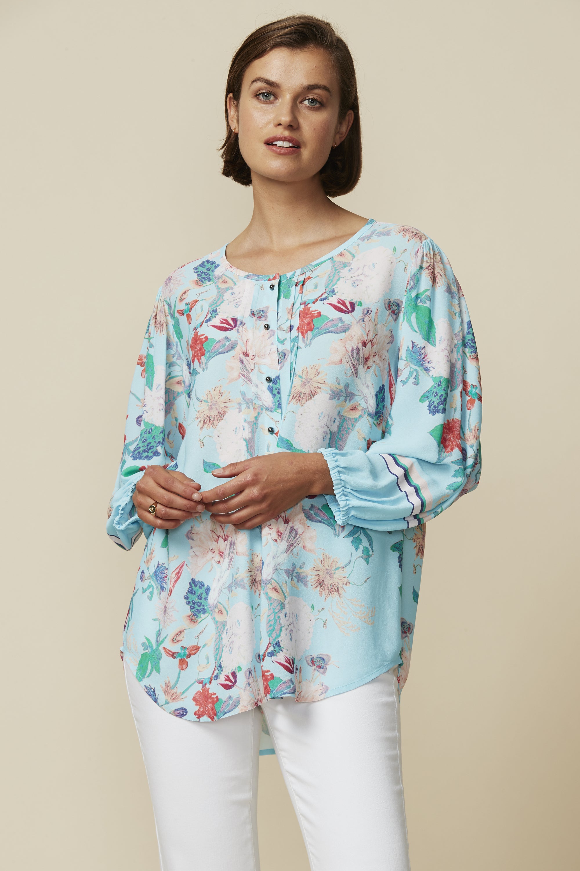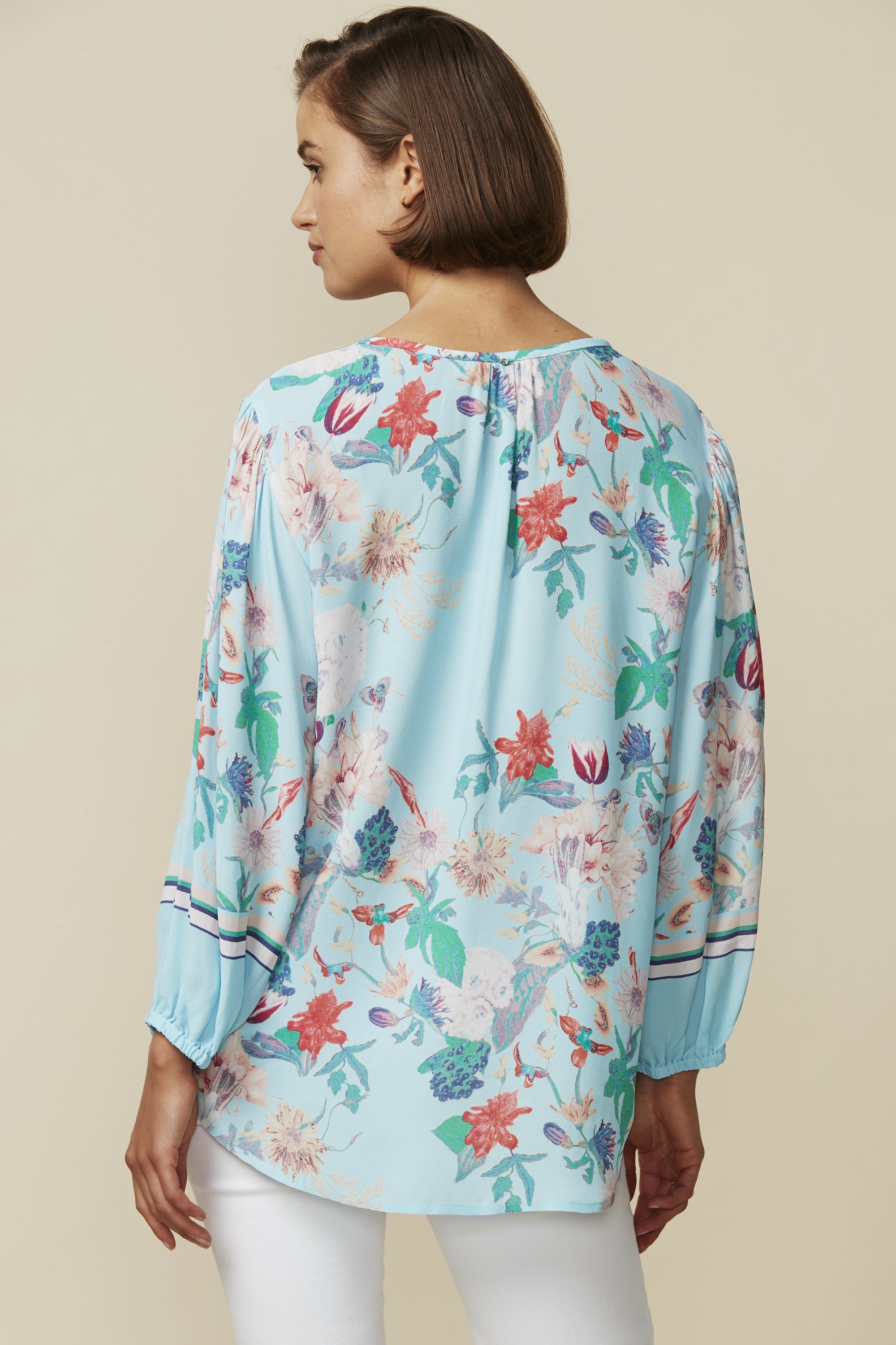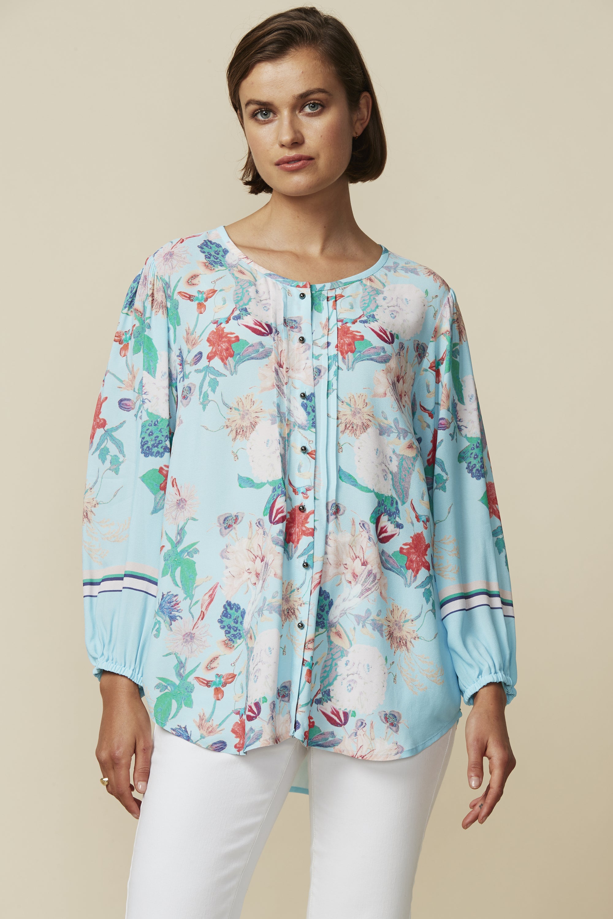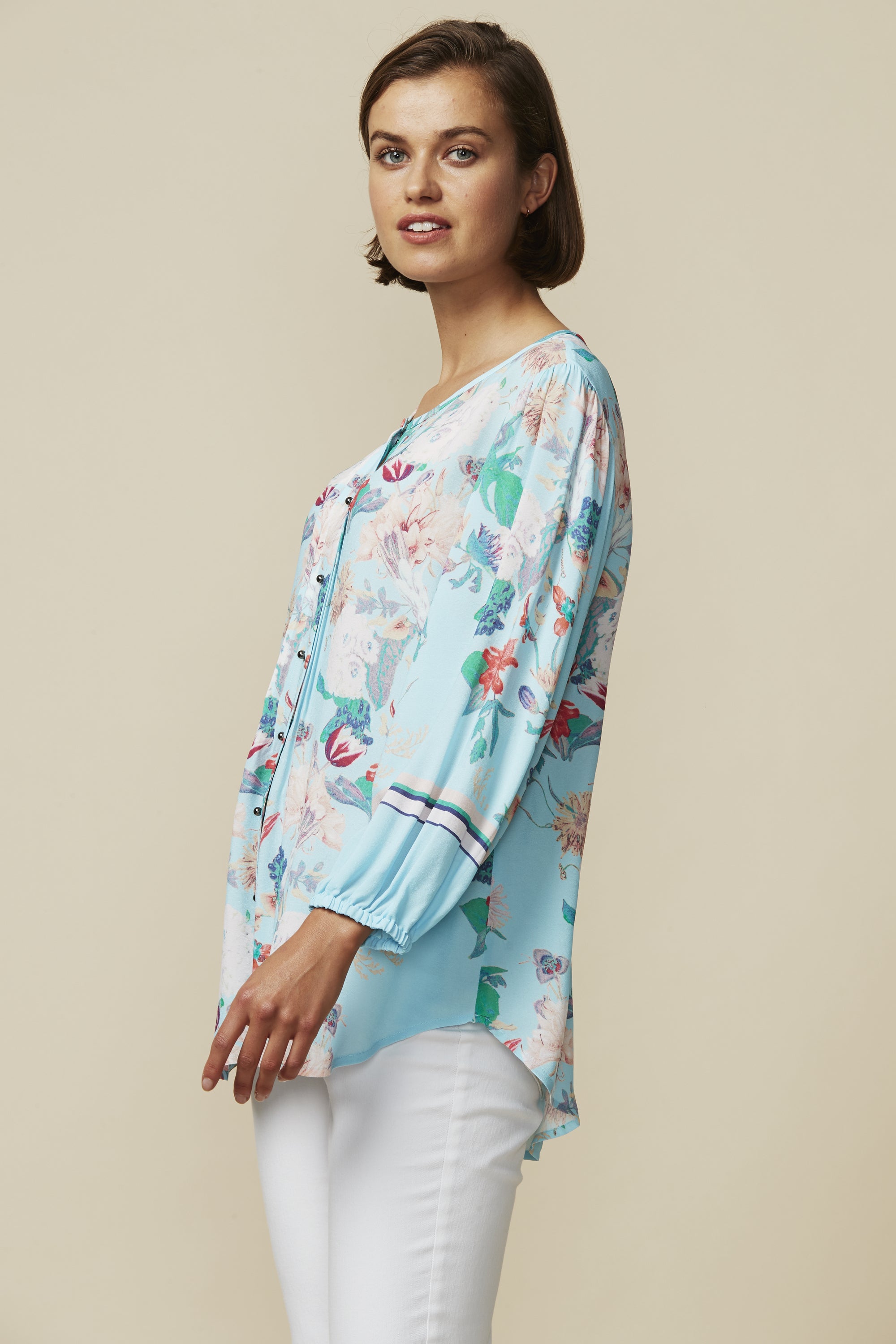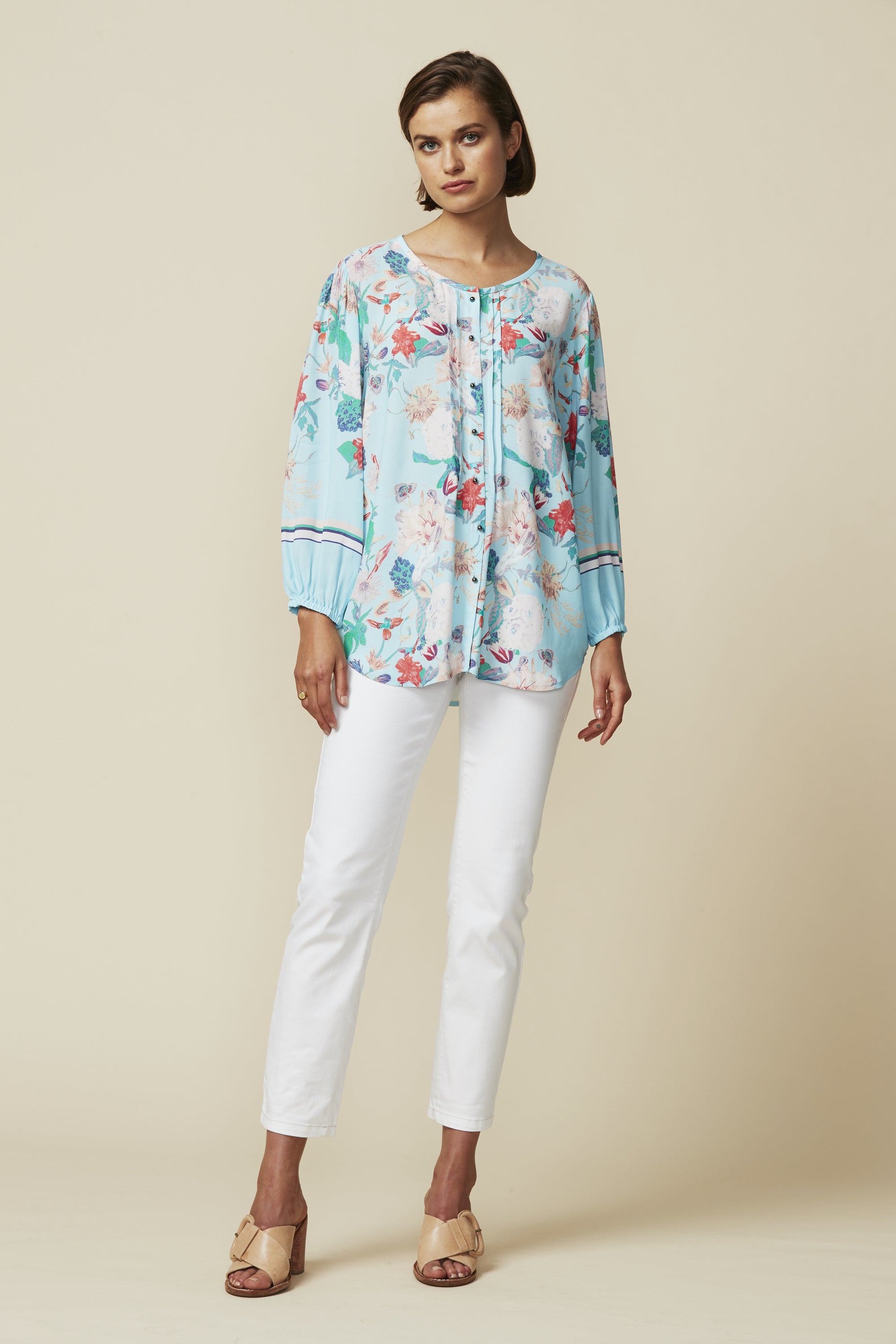 Thyme Shirt is in a captivating print, elbow length sleeves featuring border print ; round neck with front pleat detail and dainty antique buttons.