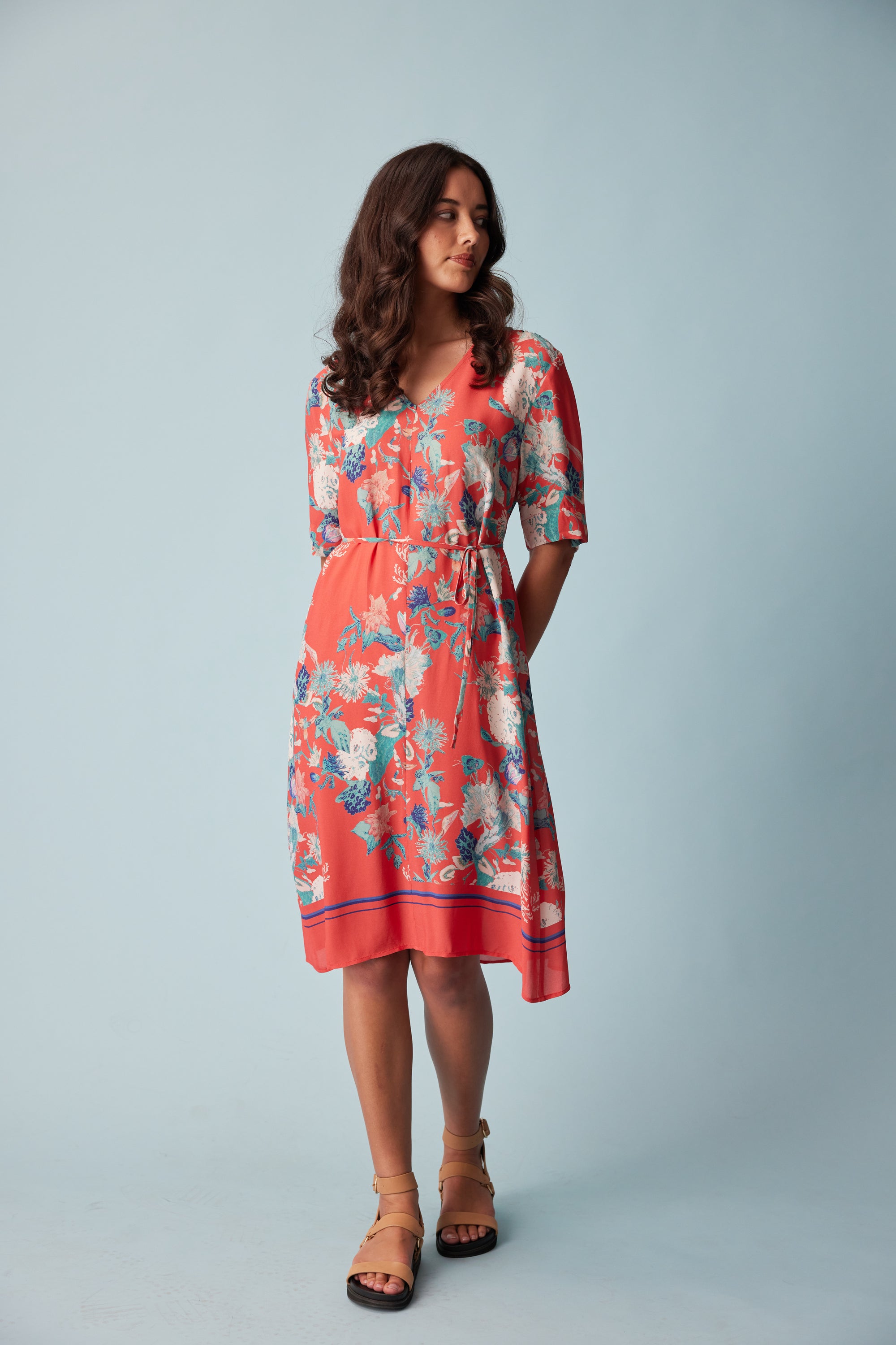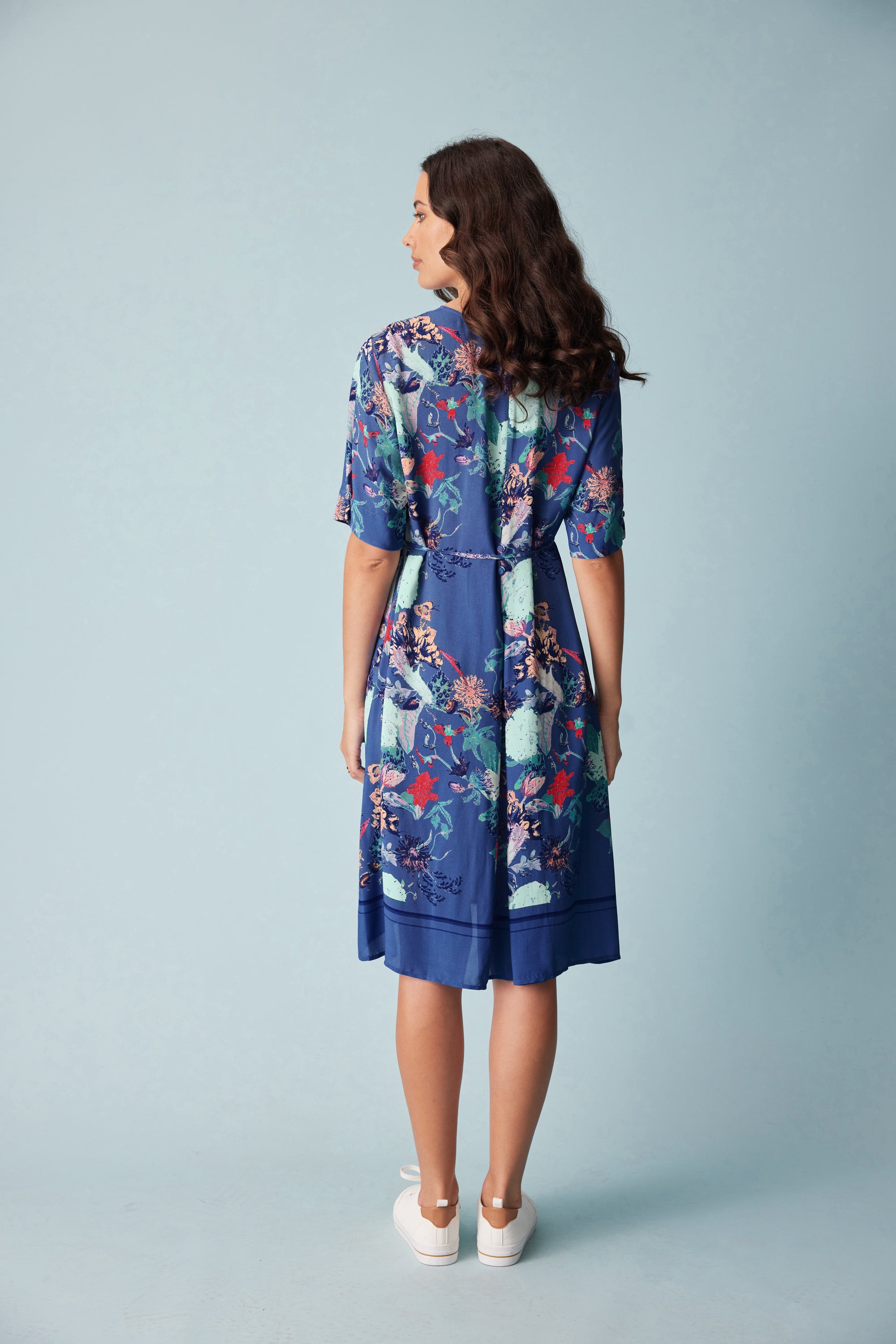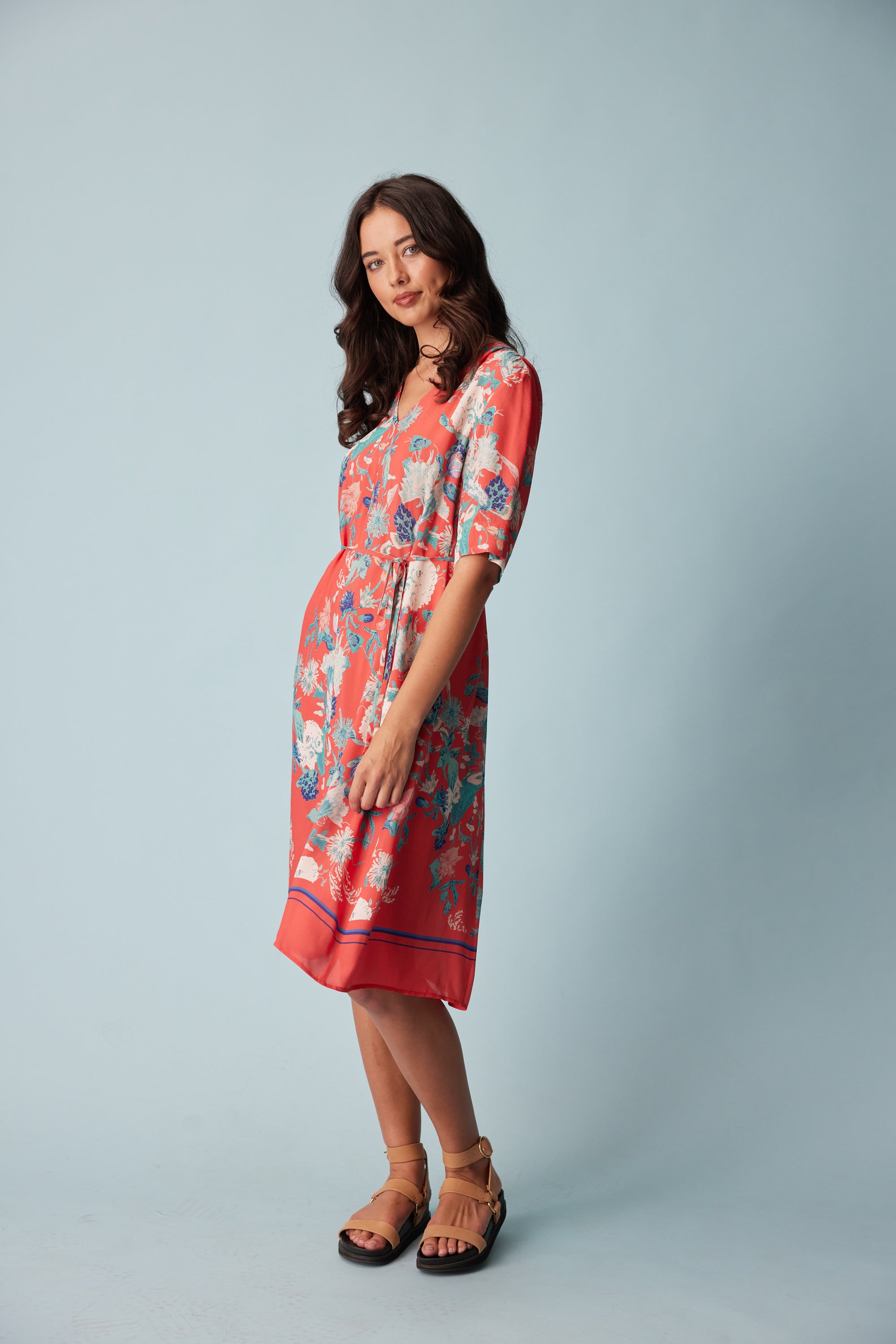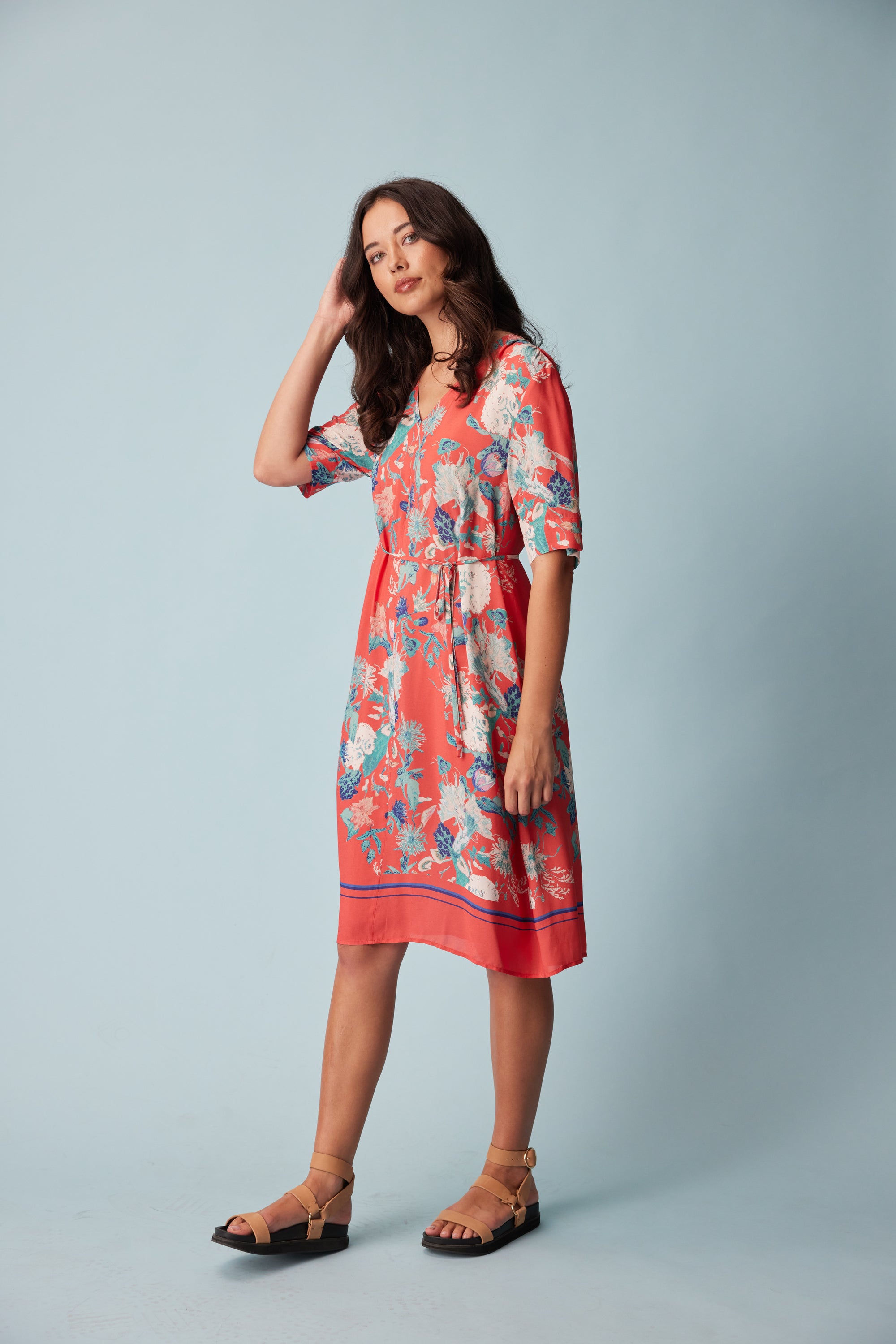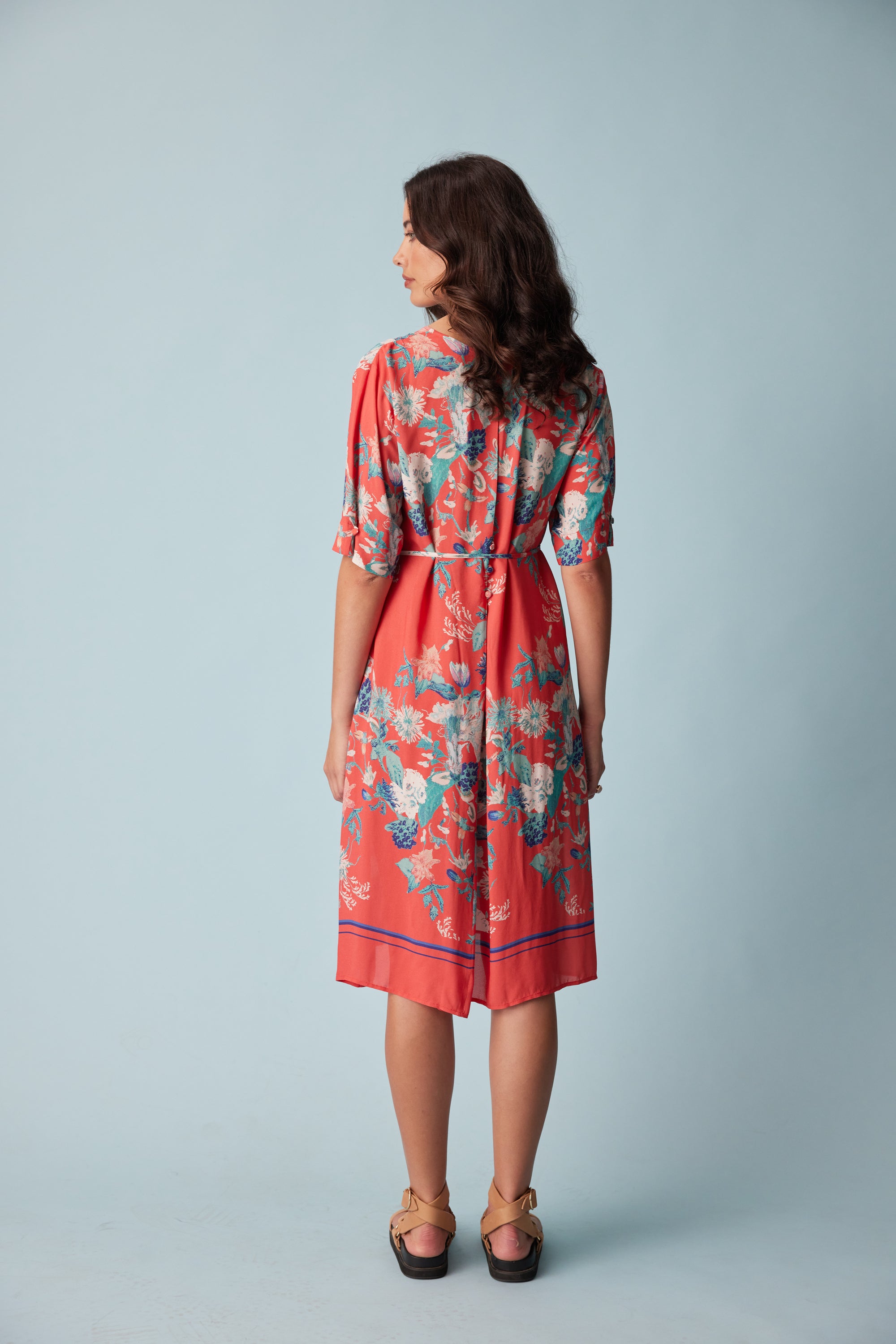 A bold floral dress, animated by light gathers through the shoulder and a flared skirt. Featuring a removable rouleaux waist tie, centre back pleat with button detail, and rouleaux loop fasteners at sleeve cuff.