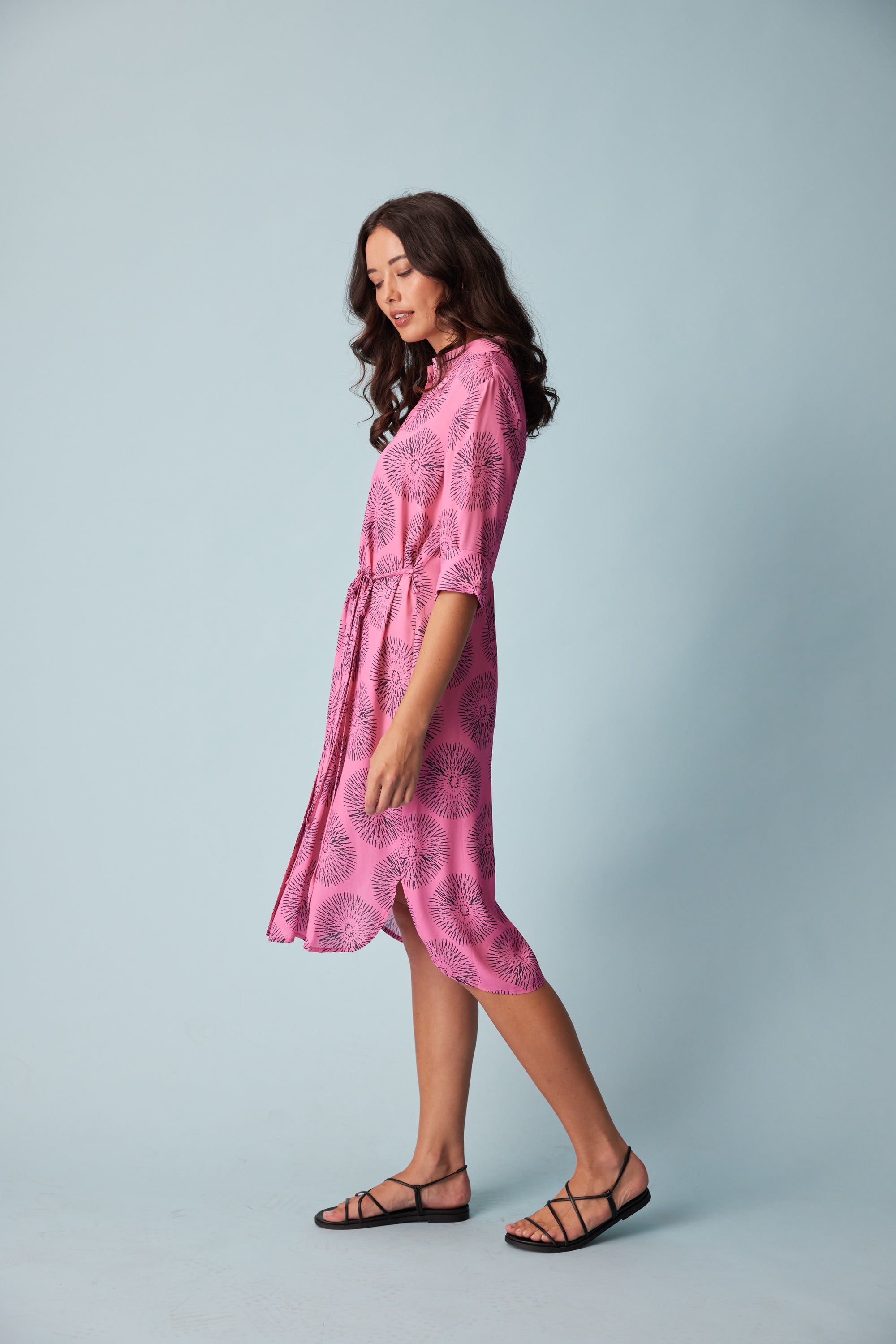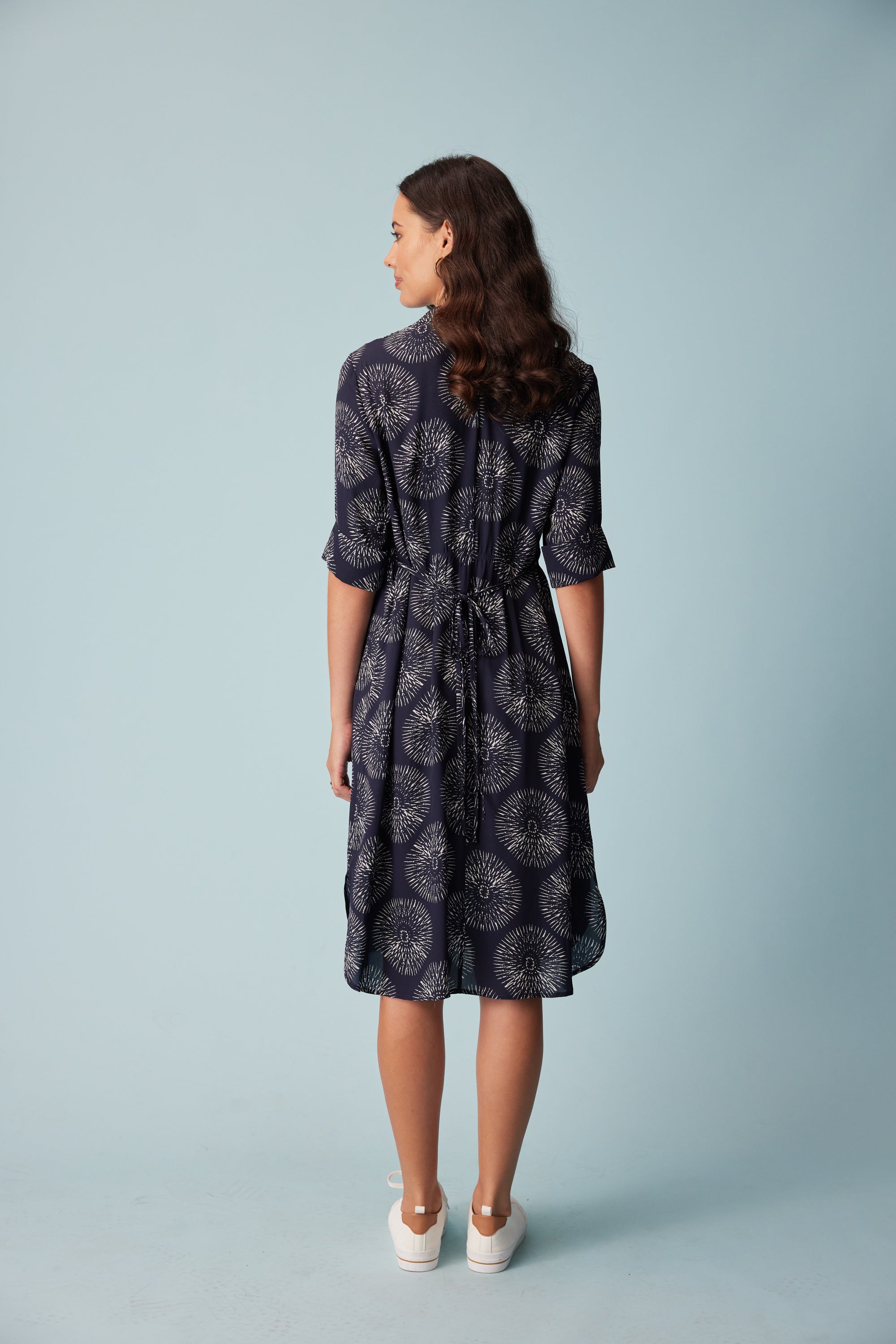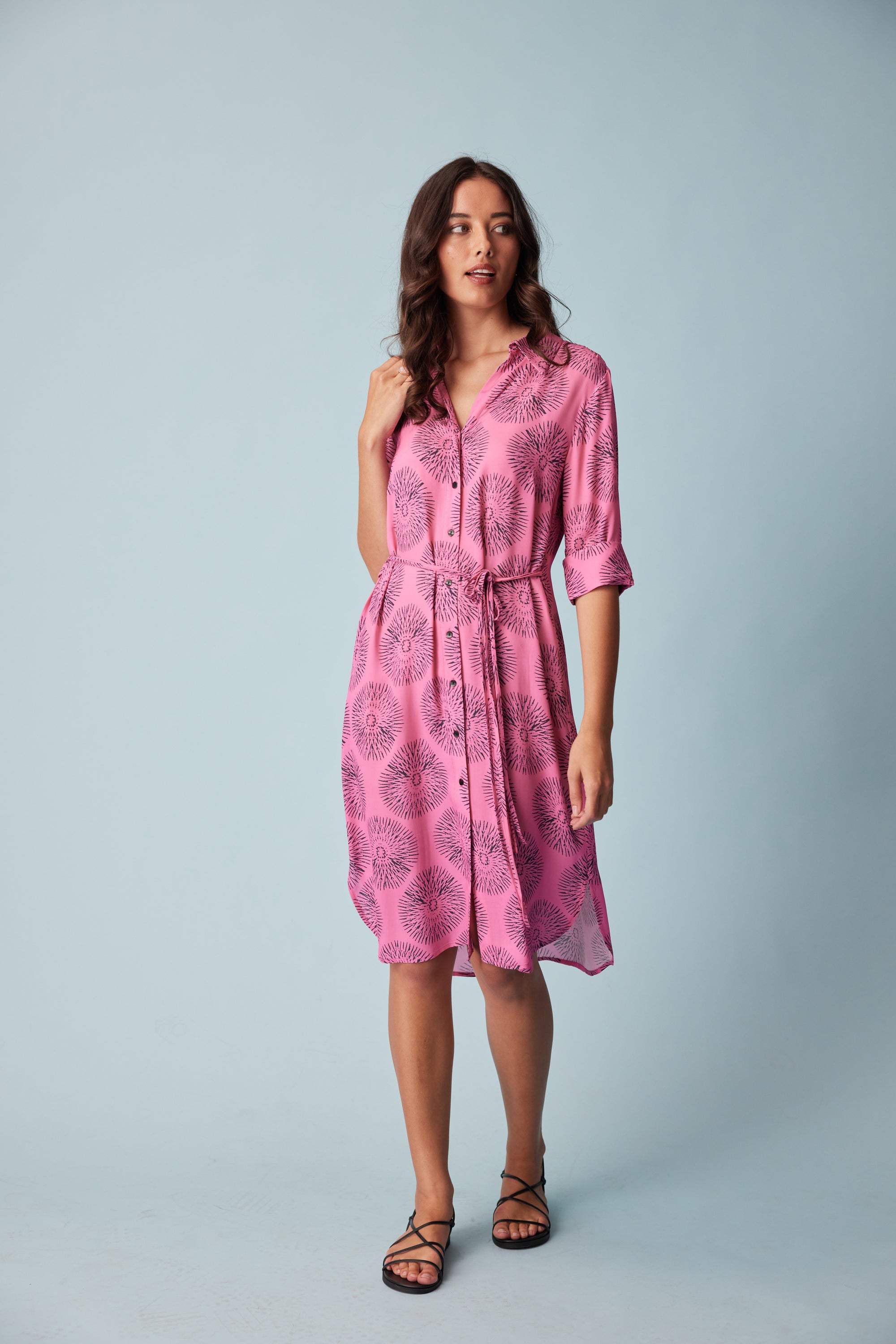 A relaxed fit 3/4 sleeve shirt dress in our bold sundial print. Design features such as the button through placket, removable waist ties and a shirt tail hem bring a polished sense of ease to this style.