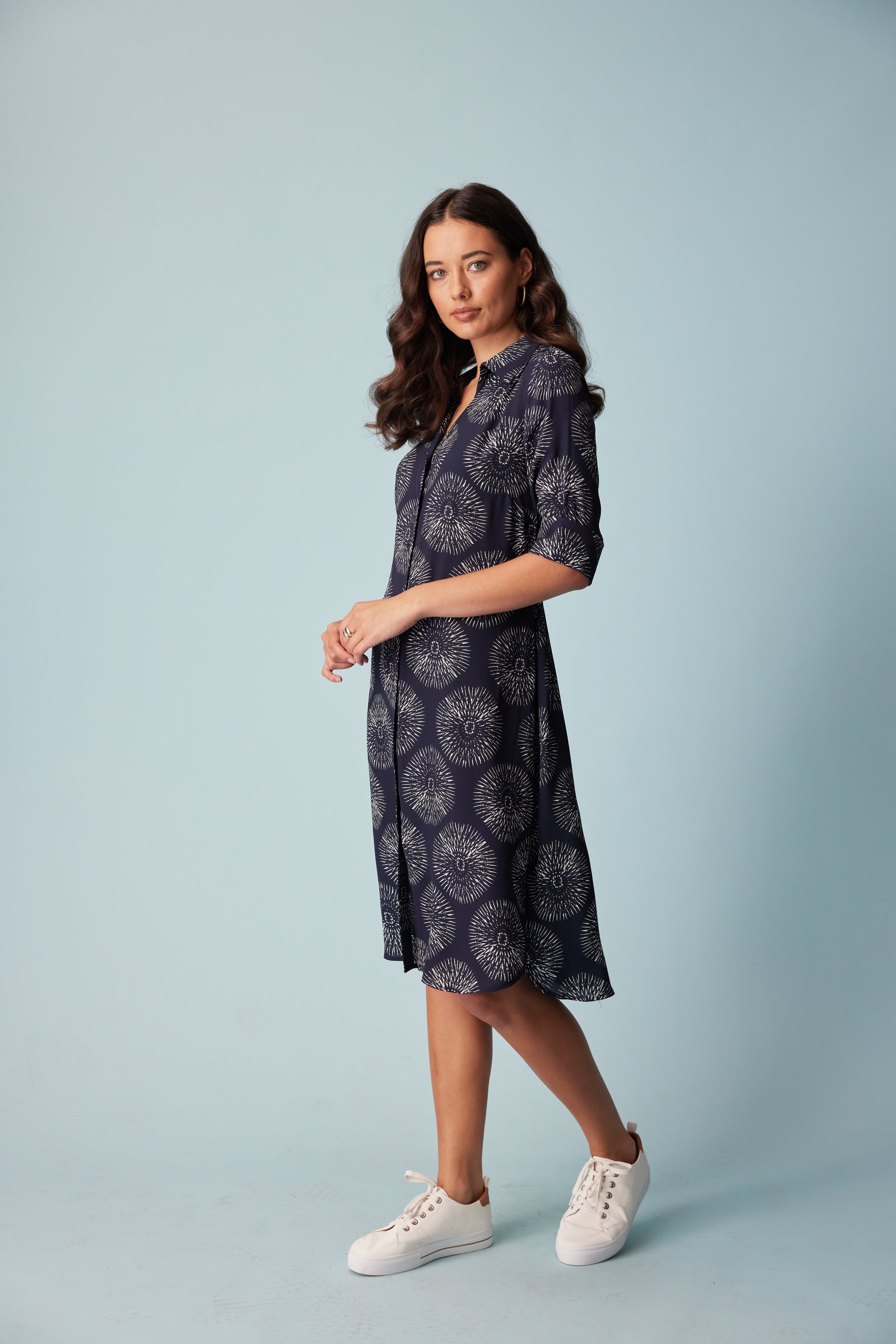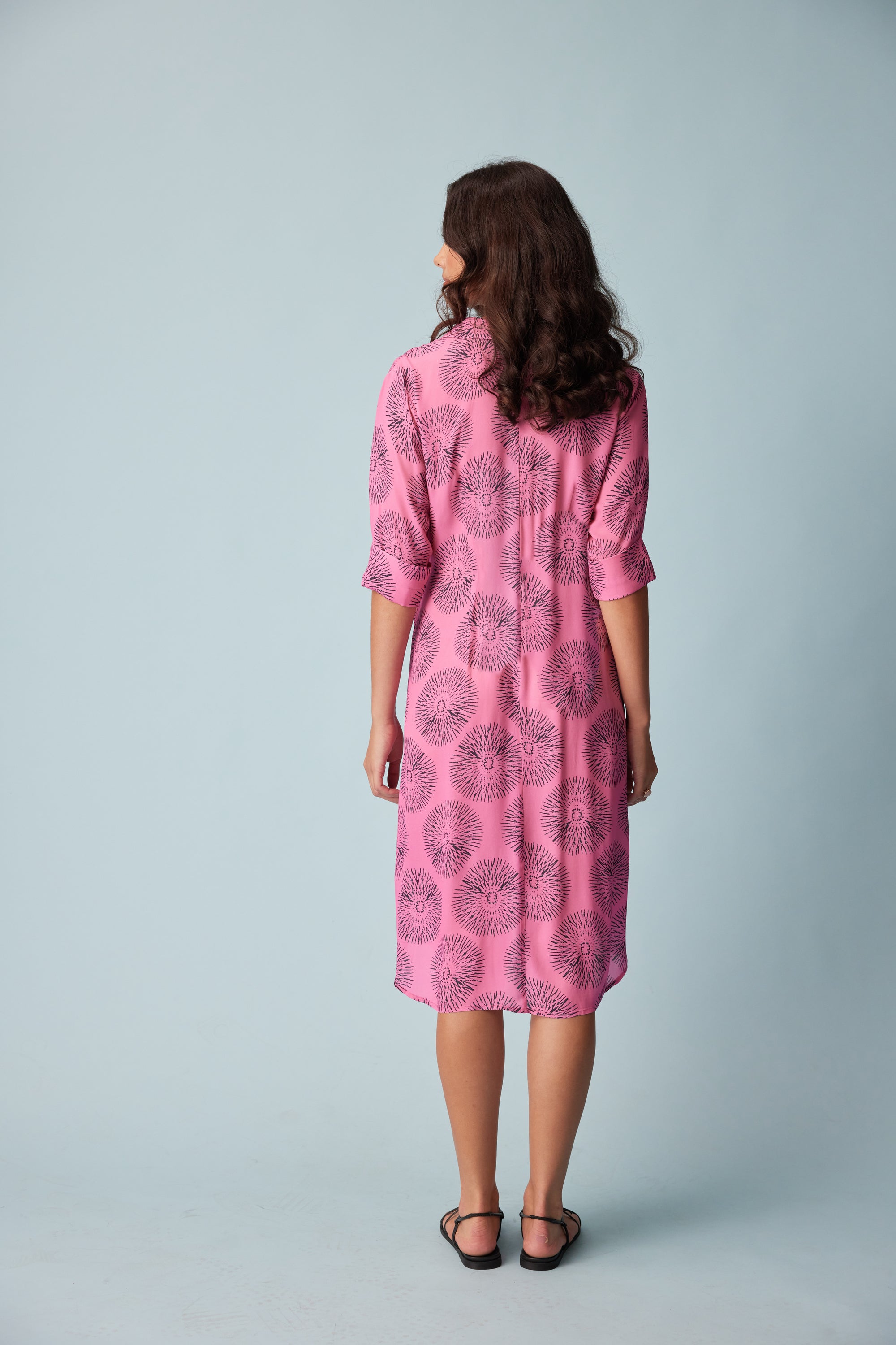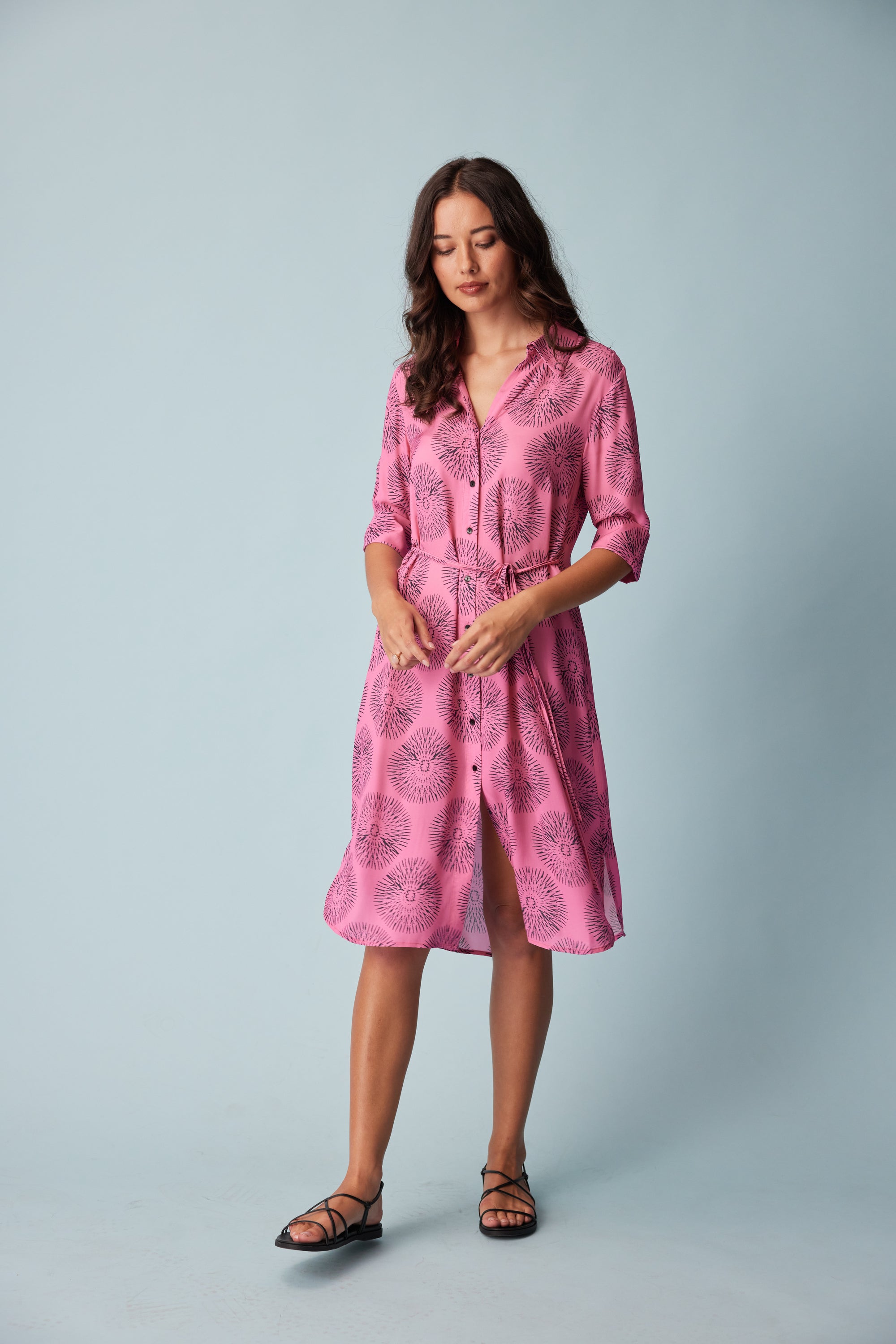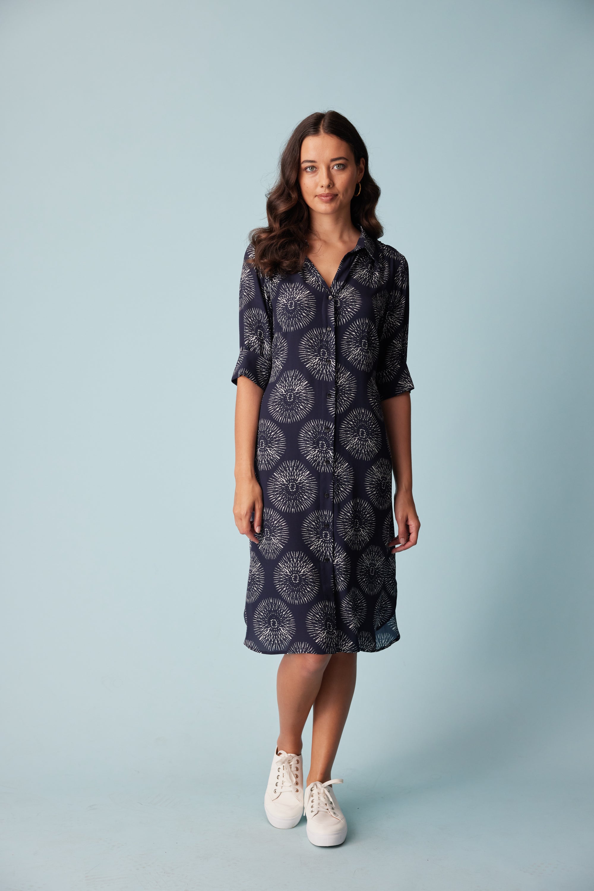 A relaxed fit 3/4 sleeve shirt dress in our bold sundial print. Design features such as the button through placket, removable waist ties and a shirt tail hem bring a polished sense of ease to this style.