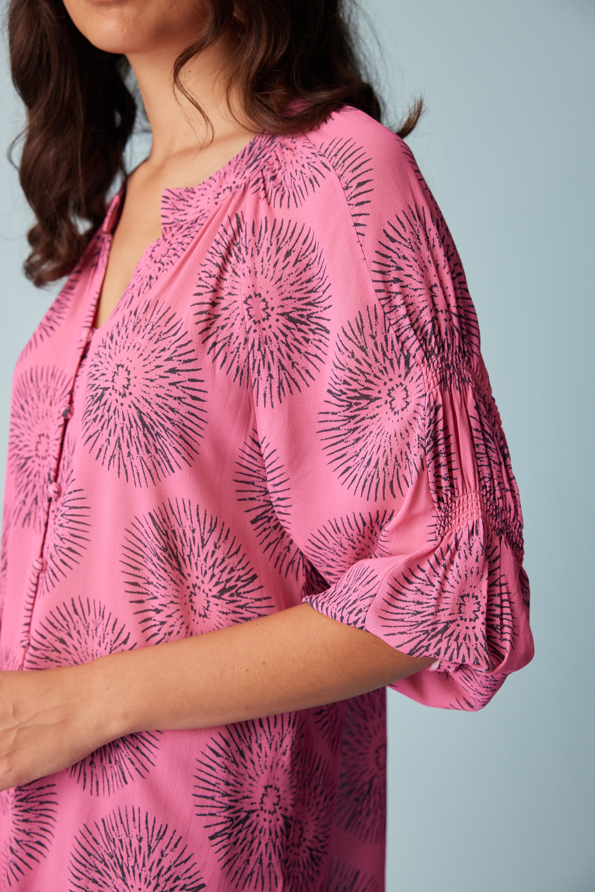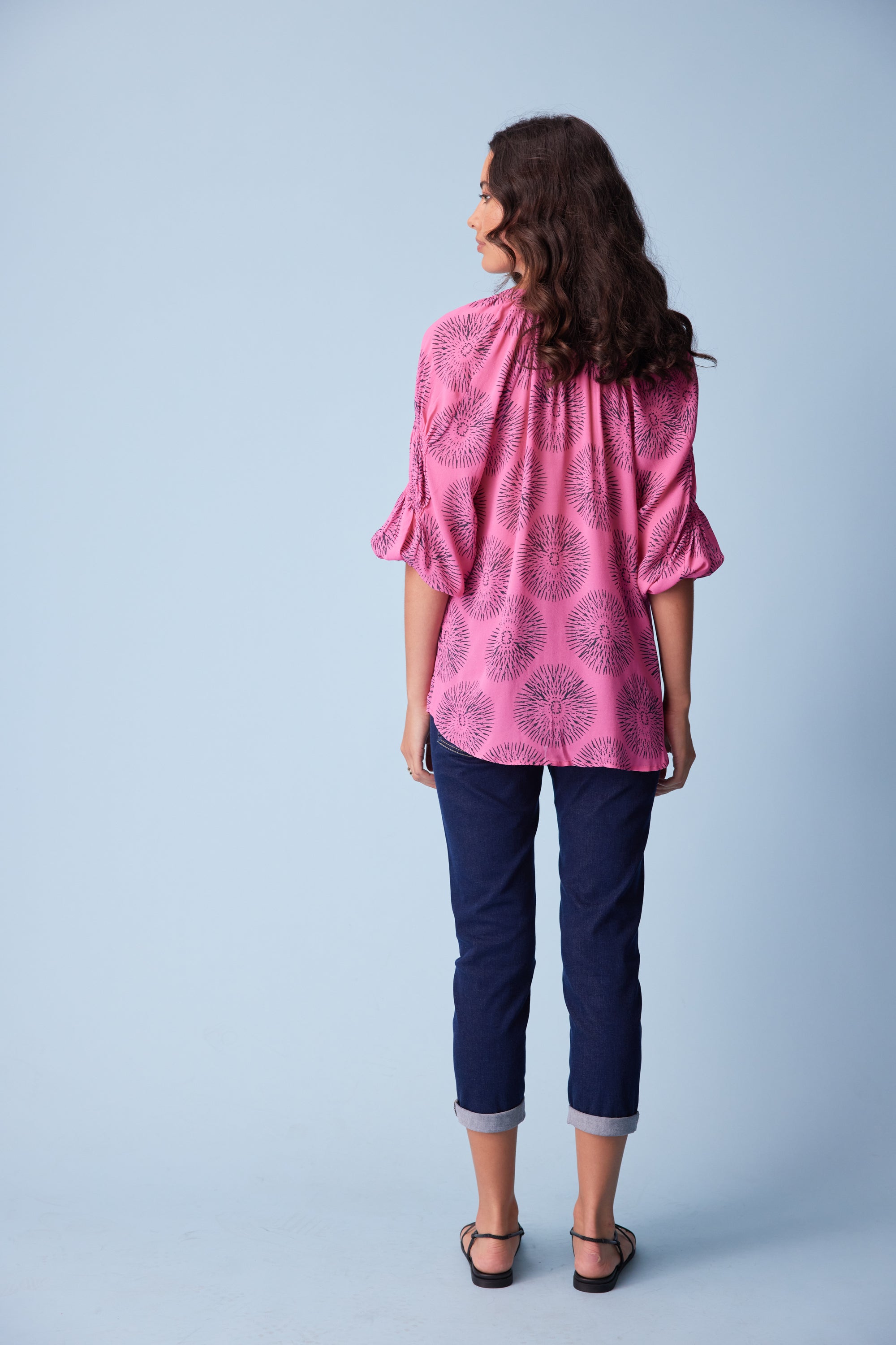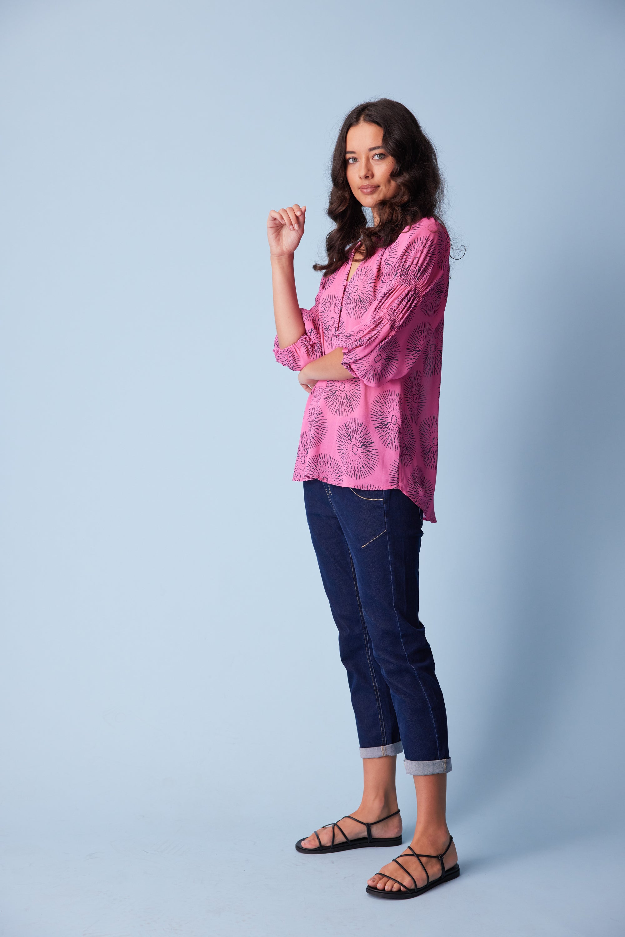 Our bold sundial print takes form in a relaxed fit raglan sleeve shirt. The soft gathered neckline, fabric covered buttons and shirring detail at the outer sleeves all contribute to the refined femininity of this style.
