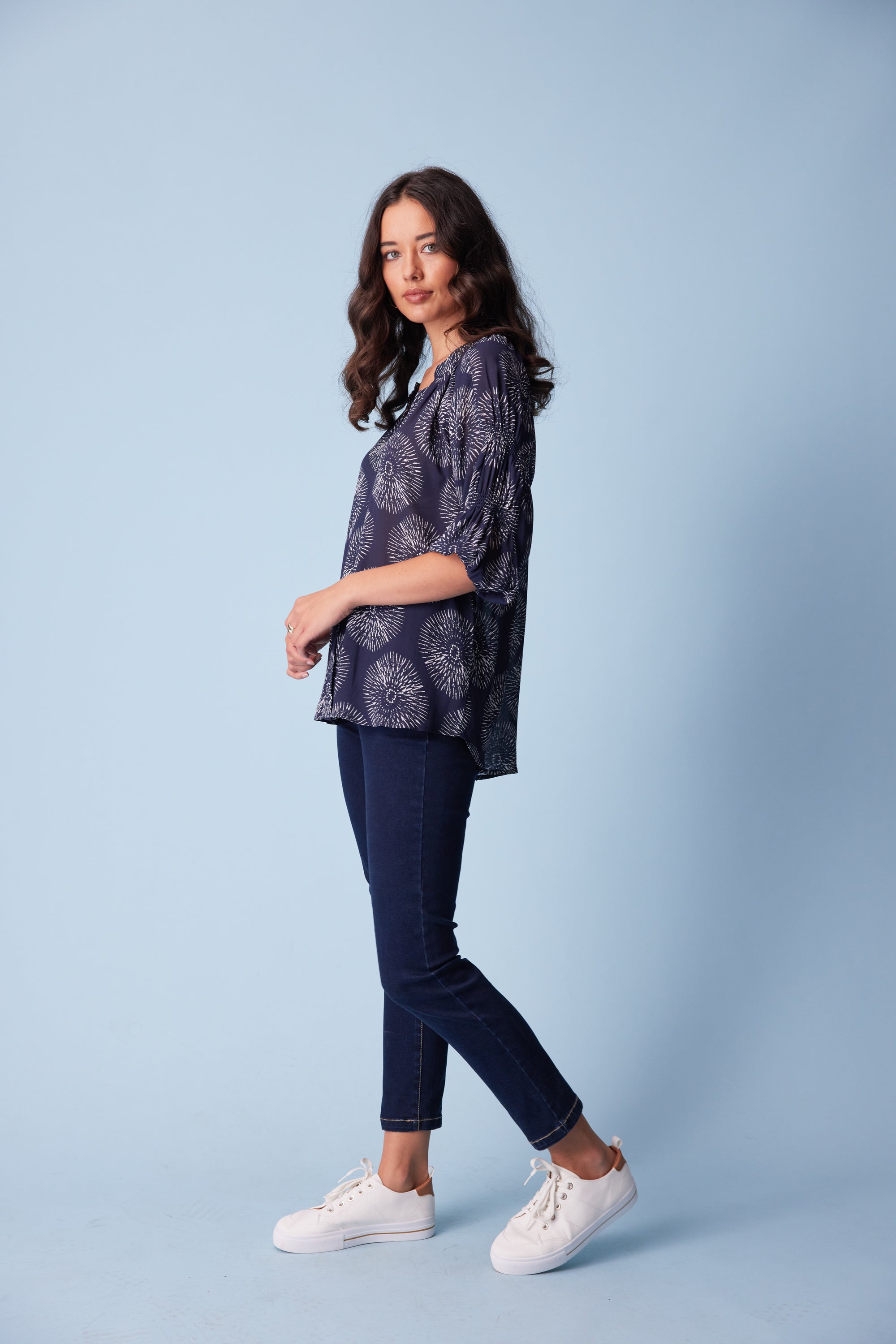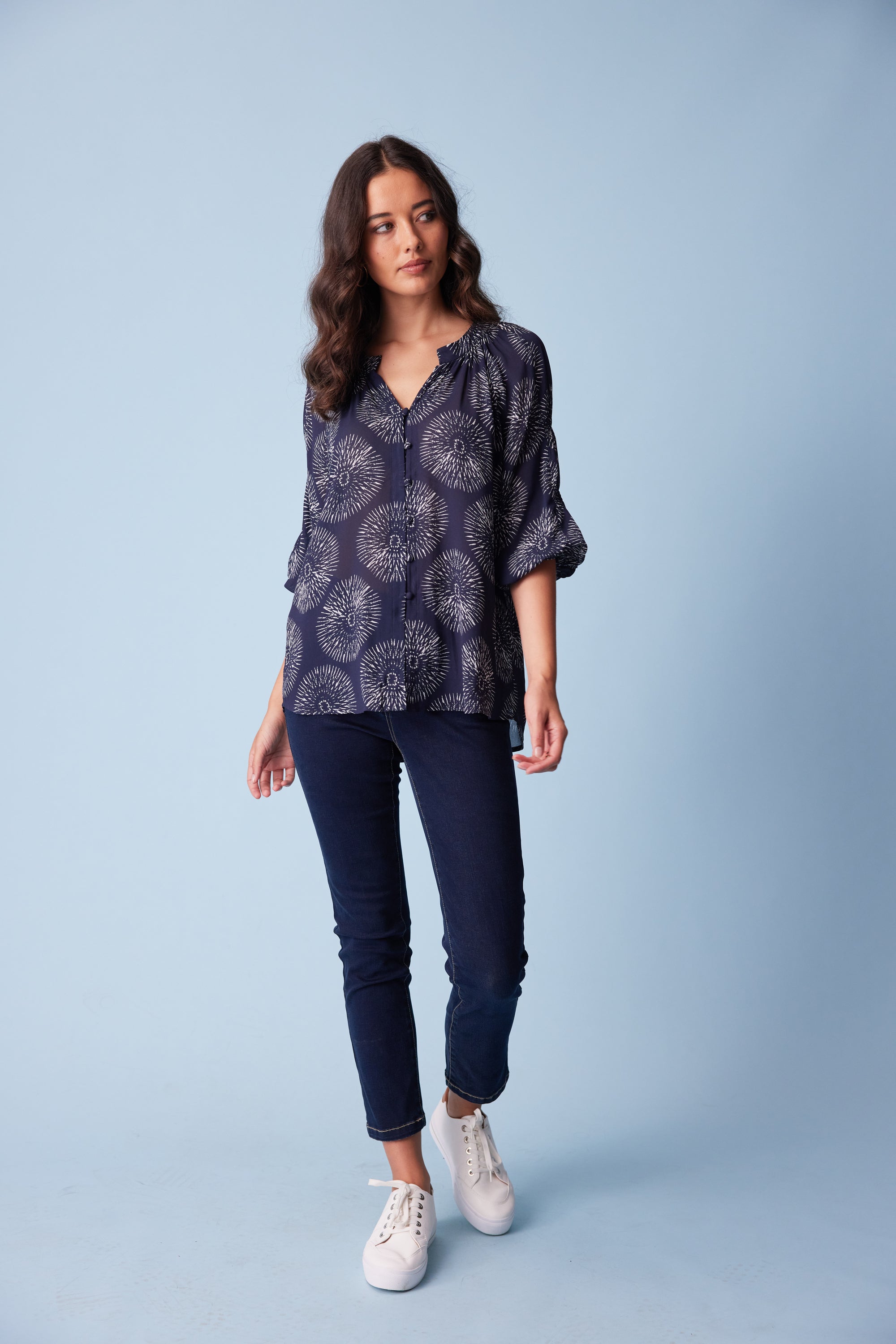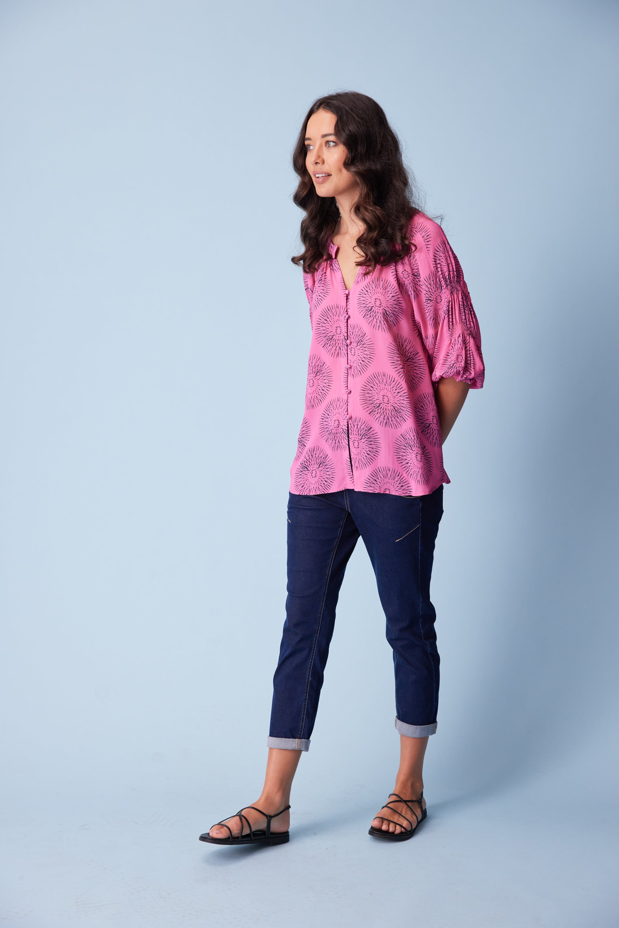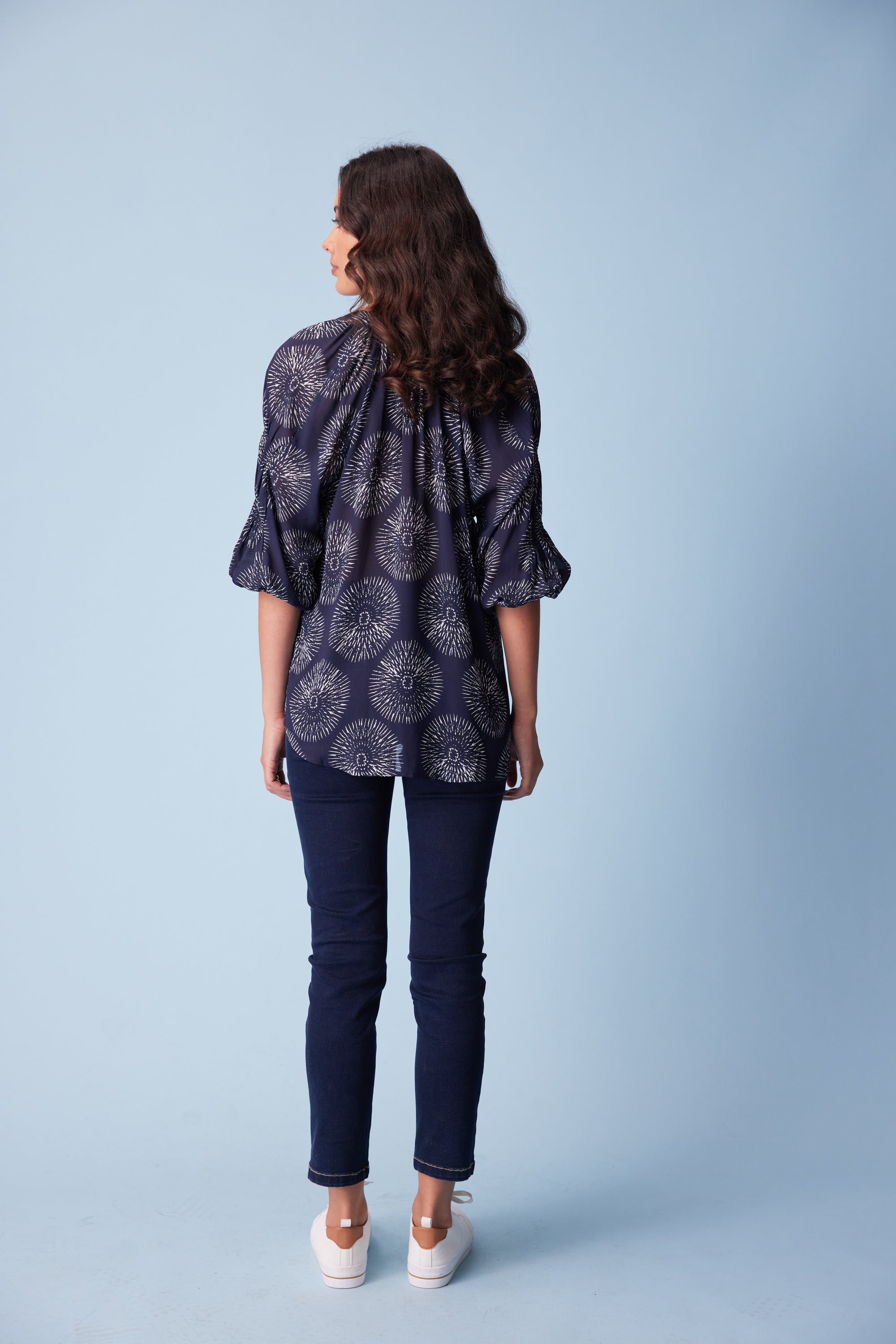Our bold sundial print takes form in a relaxed fit raglan sleeve shirt. The soft gathered neckline, fabric covered buttons and shirring detail at the outer sleeves all contribute to the refined femininity of this style.