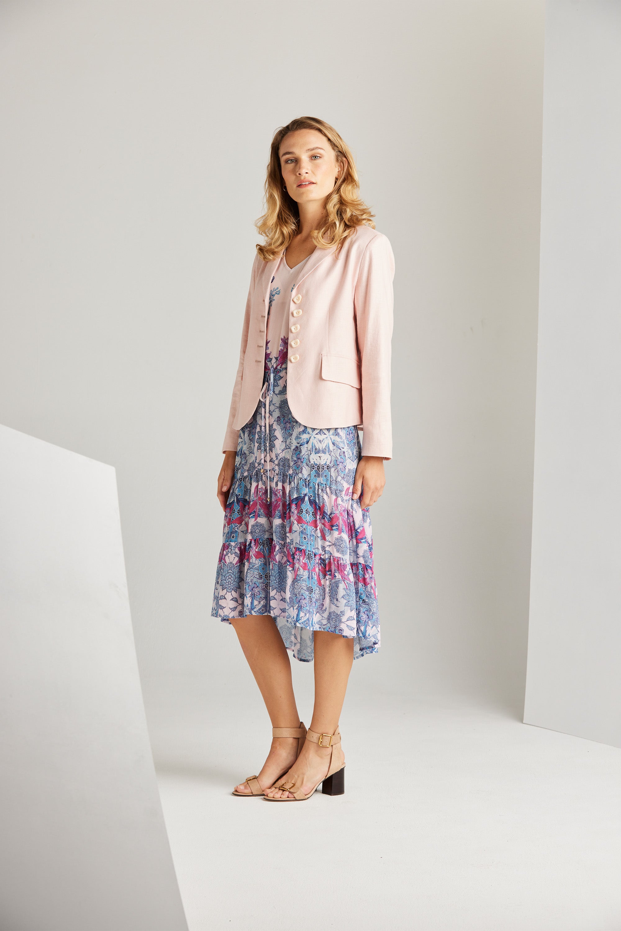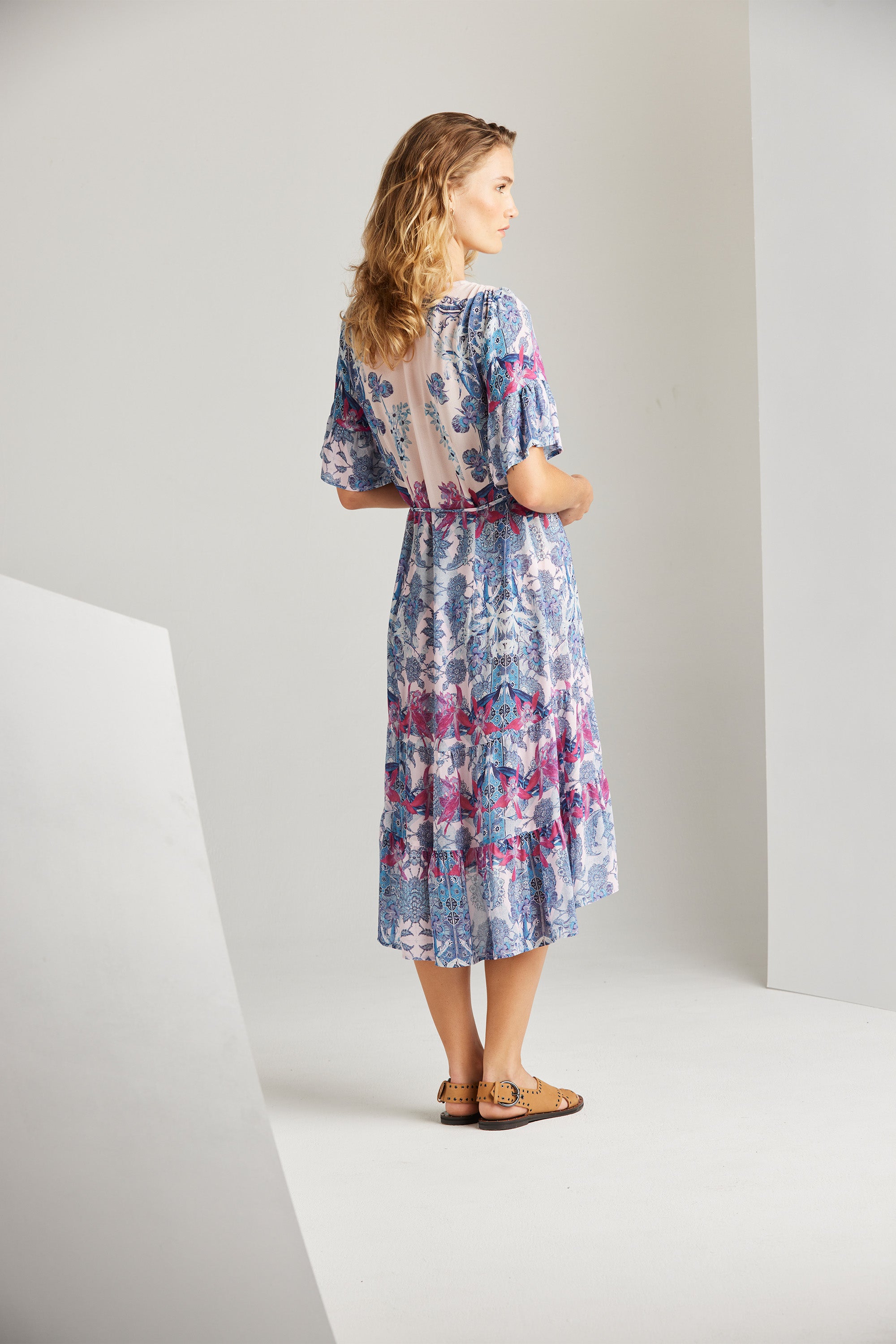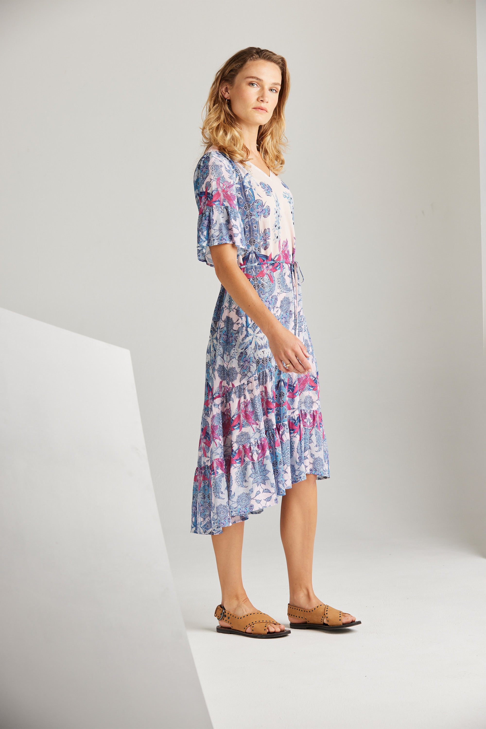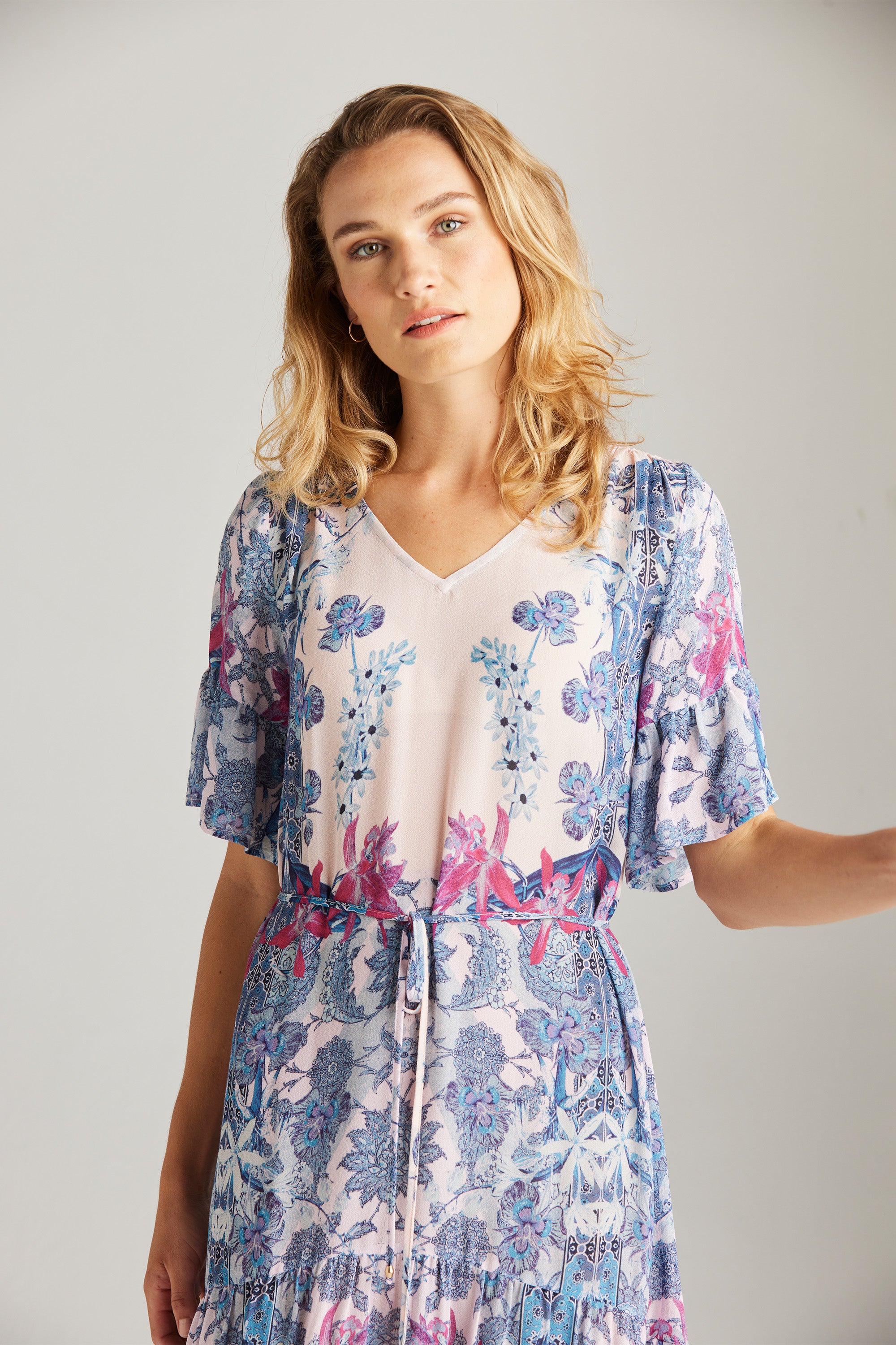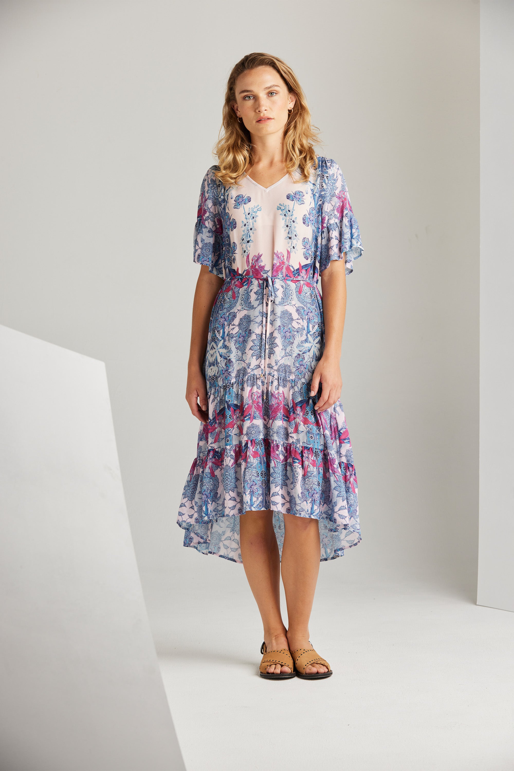 With an elegant and intricate floral print, the design of the Roxanne Dress exudes sophistication. Its romantic and feminine allure is elevated by the deep frill cuffs and the ruffled hem panel, adding a touch of charm. These lovely elements enhance this piece’s beauty, making it an exquisite choice for summer dressing.