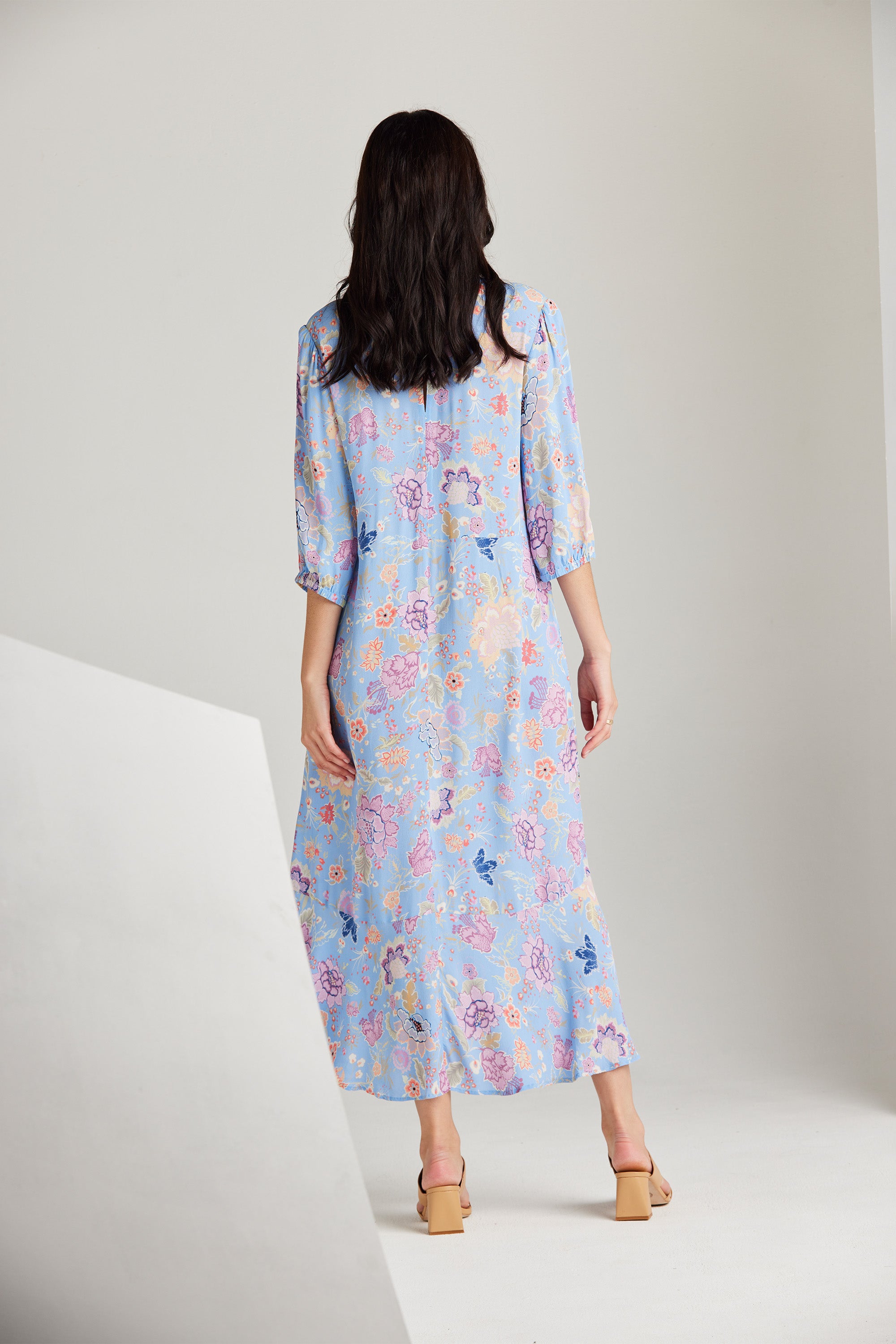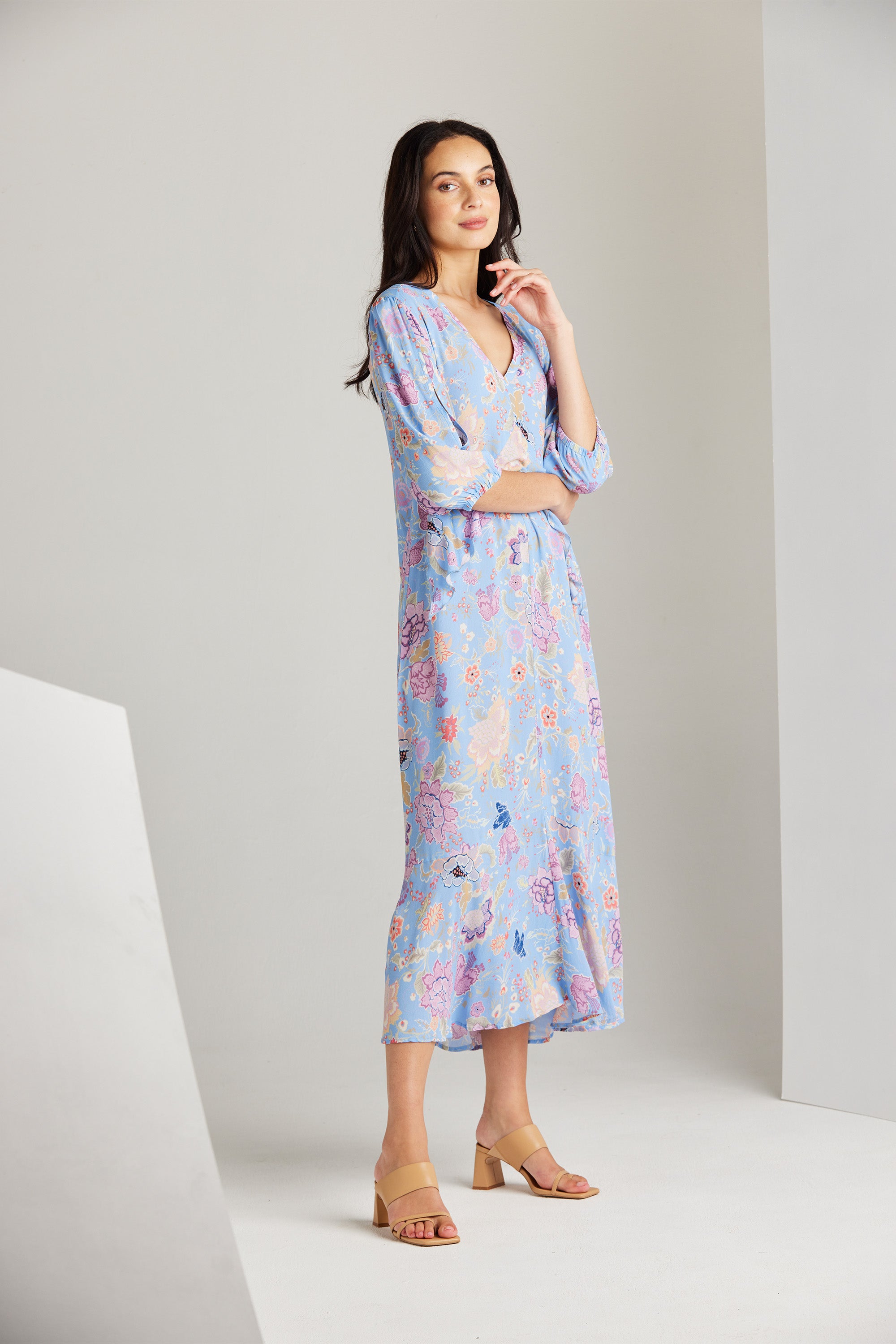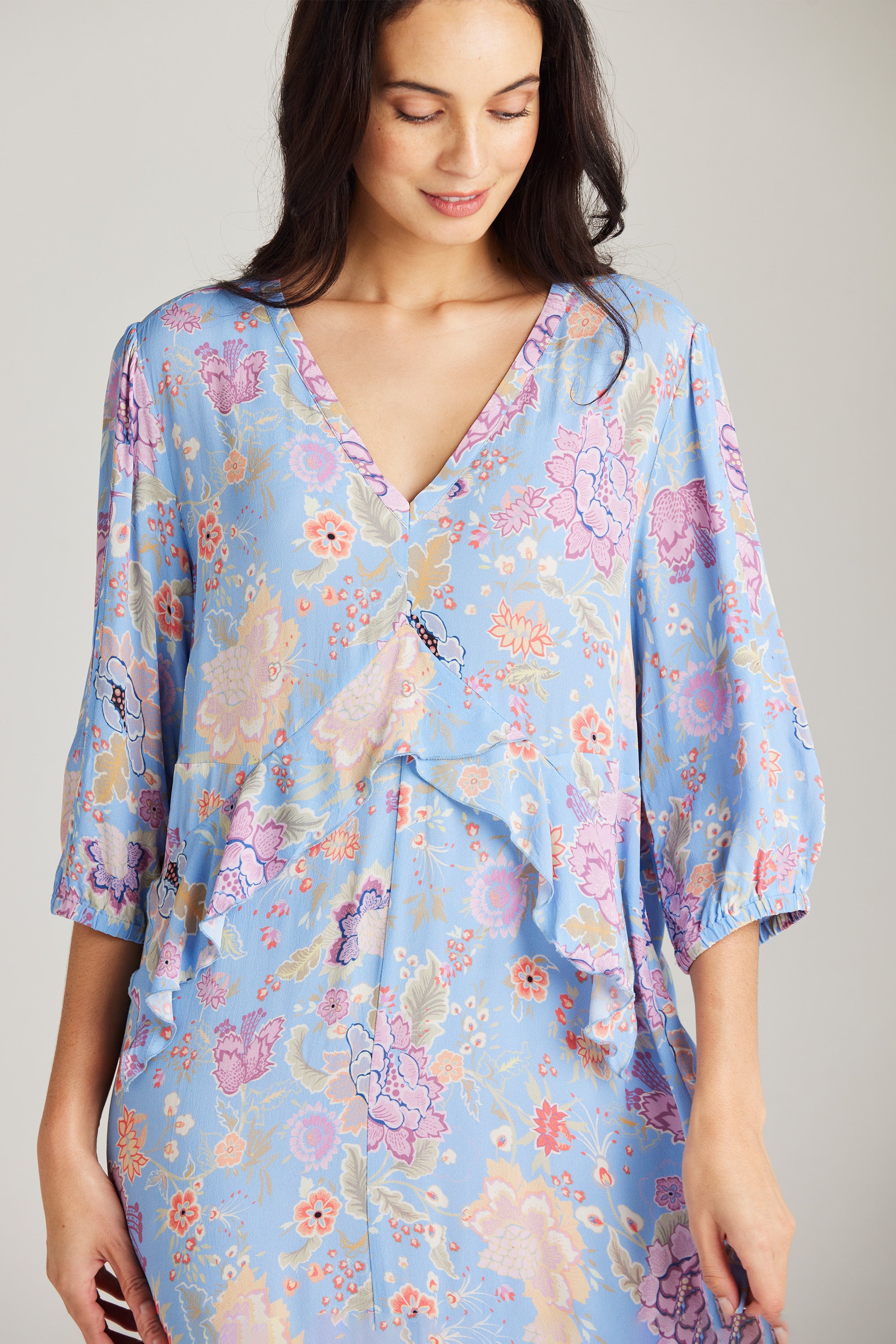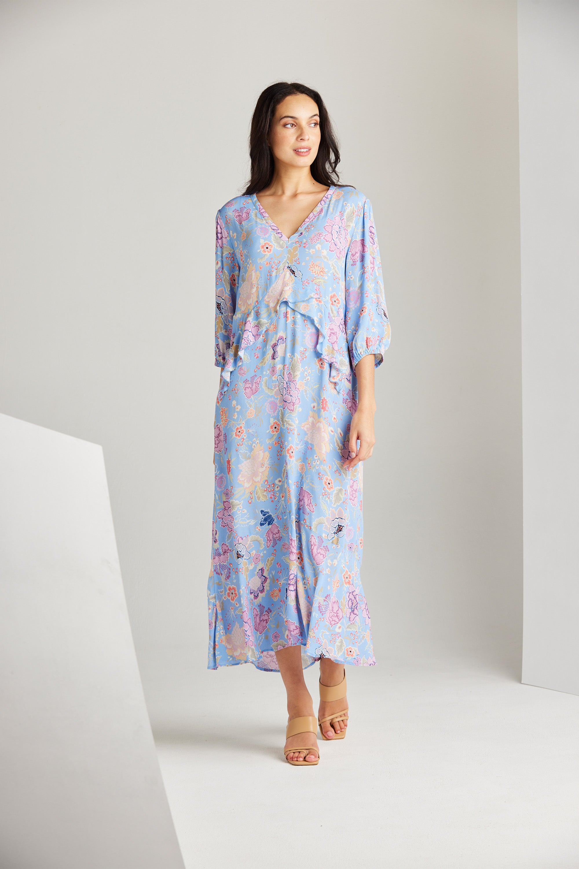 The Stella Dress, crafted in soft viscose, features a delightful floral print. Its long line silhouette culminates in a flowy panel hem making this piece absolutely flattering for any silhouette. The v-neckline and a pretty ruffle through the bodice evoke a romantic element.