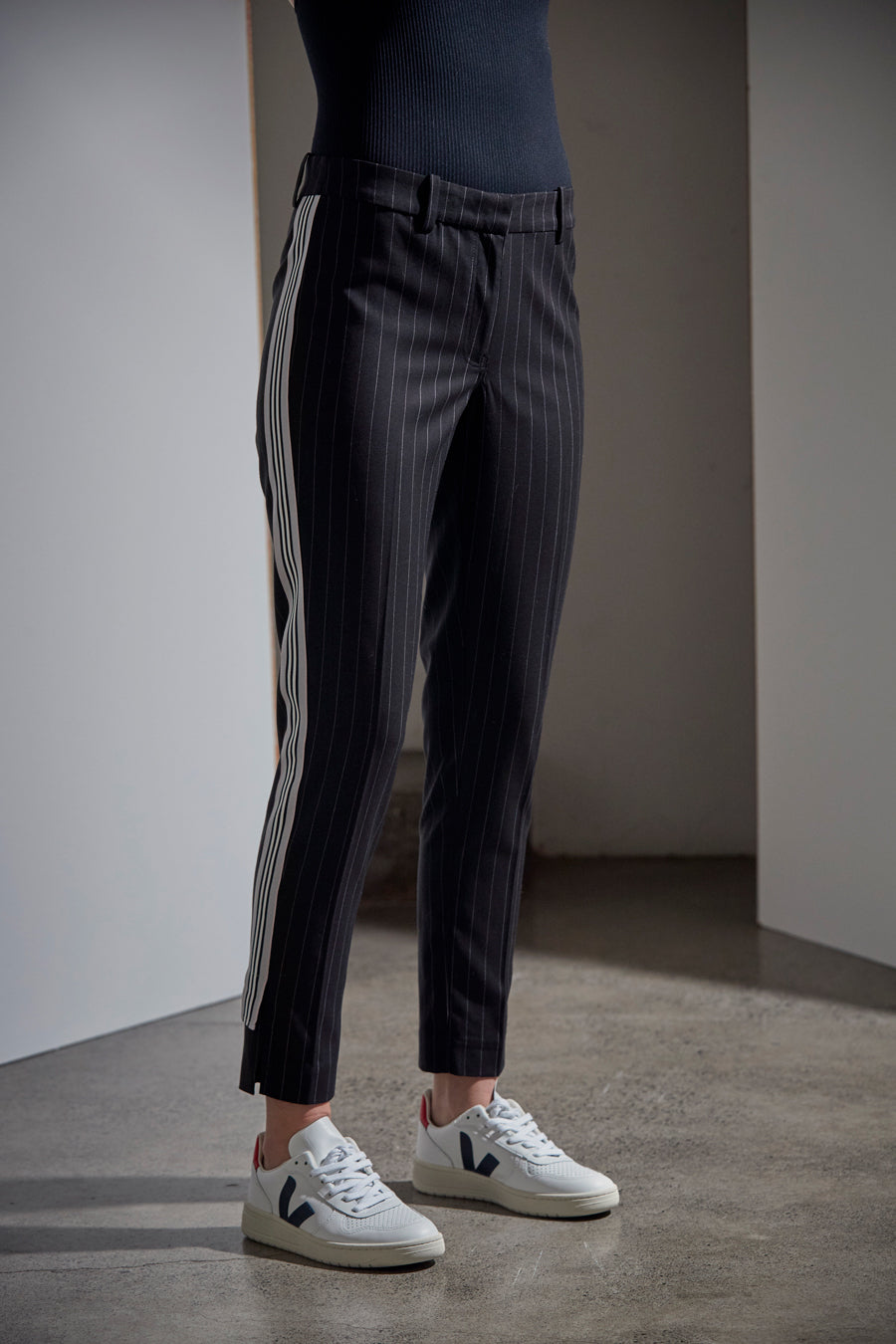 A dressy pant; slim leg with hem split; featuring novelty tape at outleg; contrast stripe waistband facing for extra comfort.