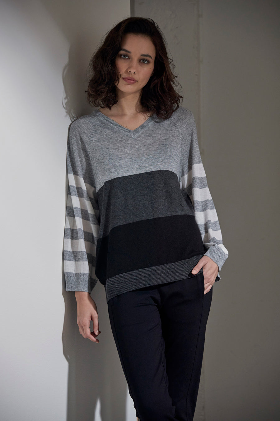 Our Breaker Sweater has a boxy fit with wide raglan sleeve for that modern look; featuring different stripes through body and sleeve.