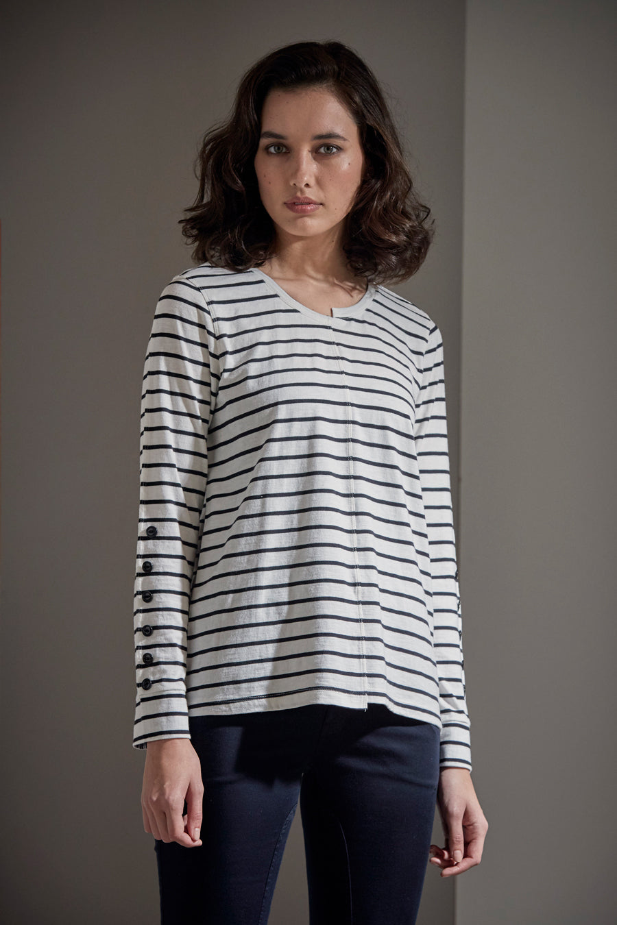 Soft 100% cotton stripe tee; long sleeve with contrast turn-up cuff and decorative buttons; round neck with step detail.