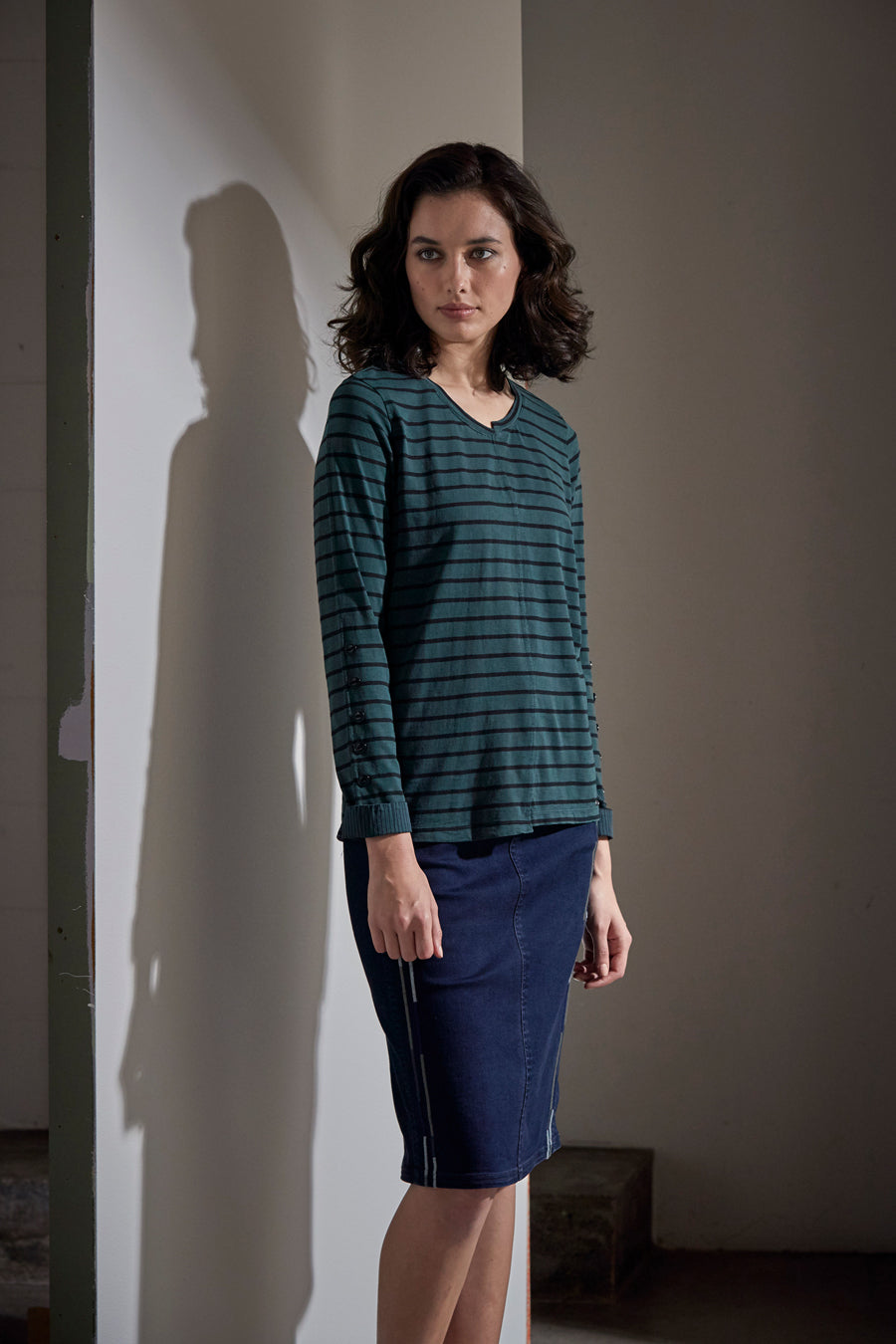 Soft 100% cotton stripe tee; long sleeve with contrast turn-up cuff and decorative buttons; round neck with step detail.