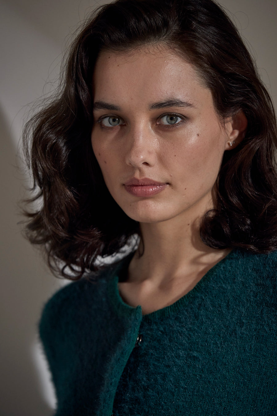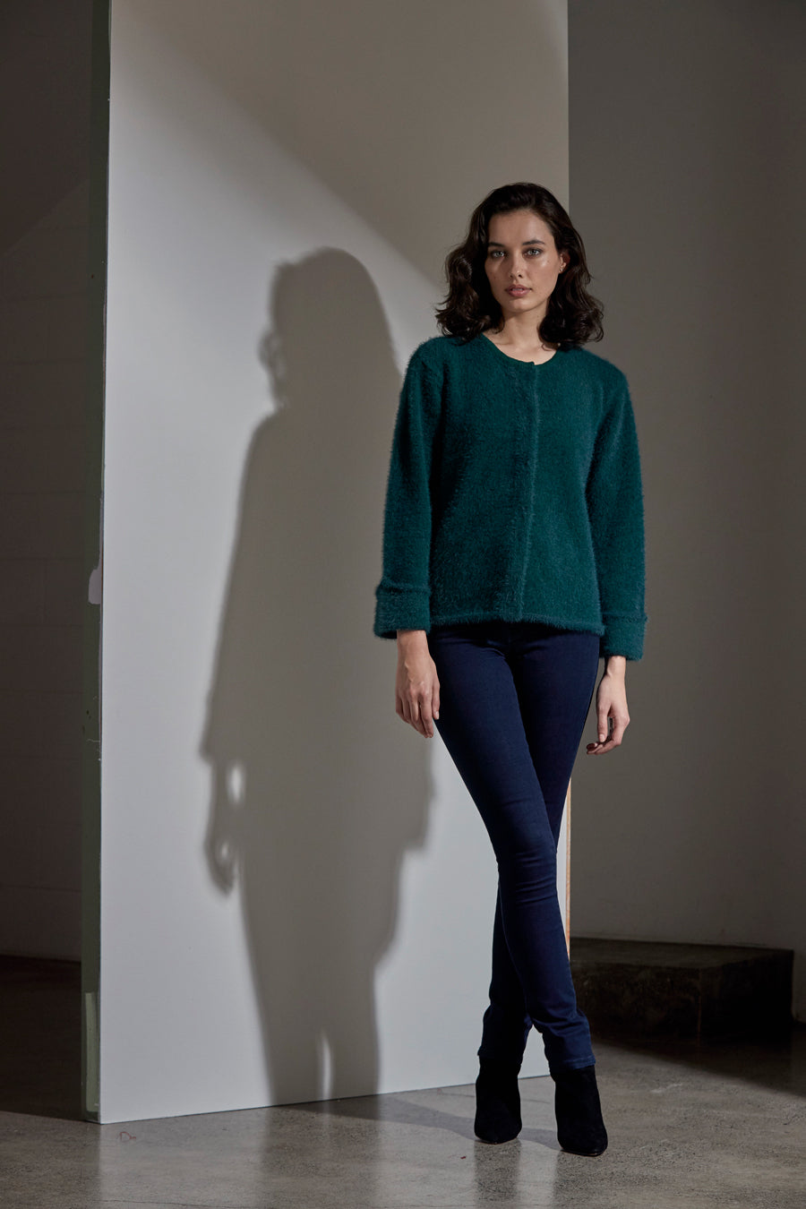 A short cosy cardigan; long sleeve with turn-up cuff; snap-dome front opening.