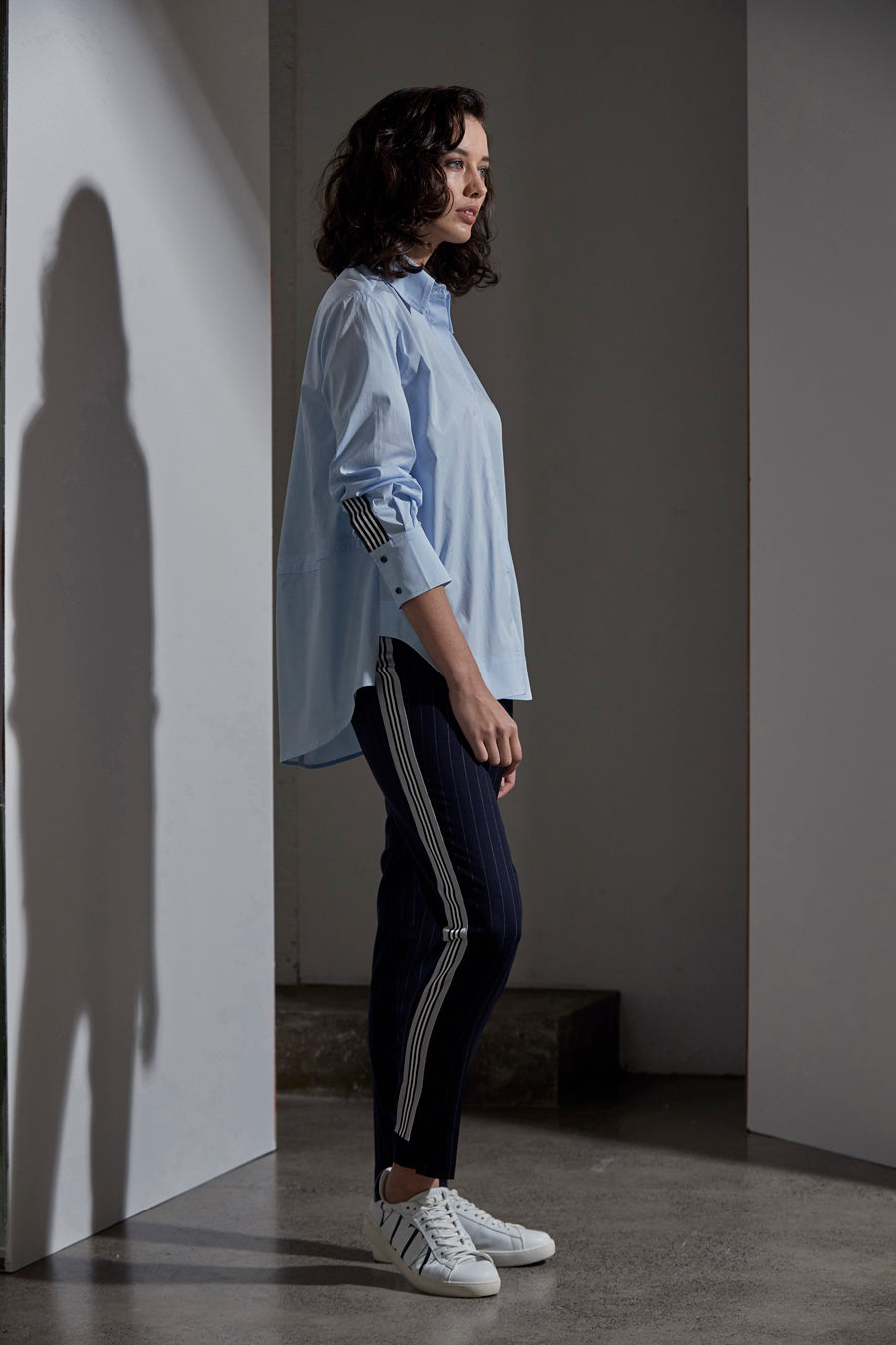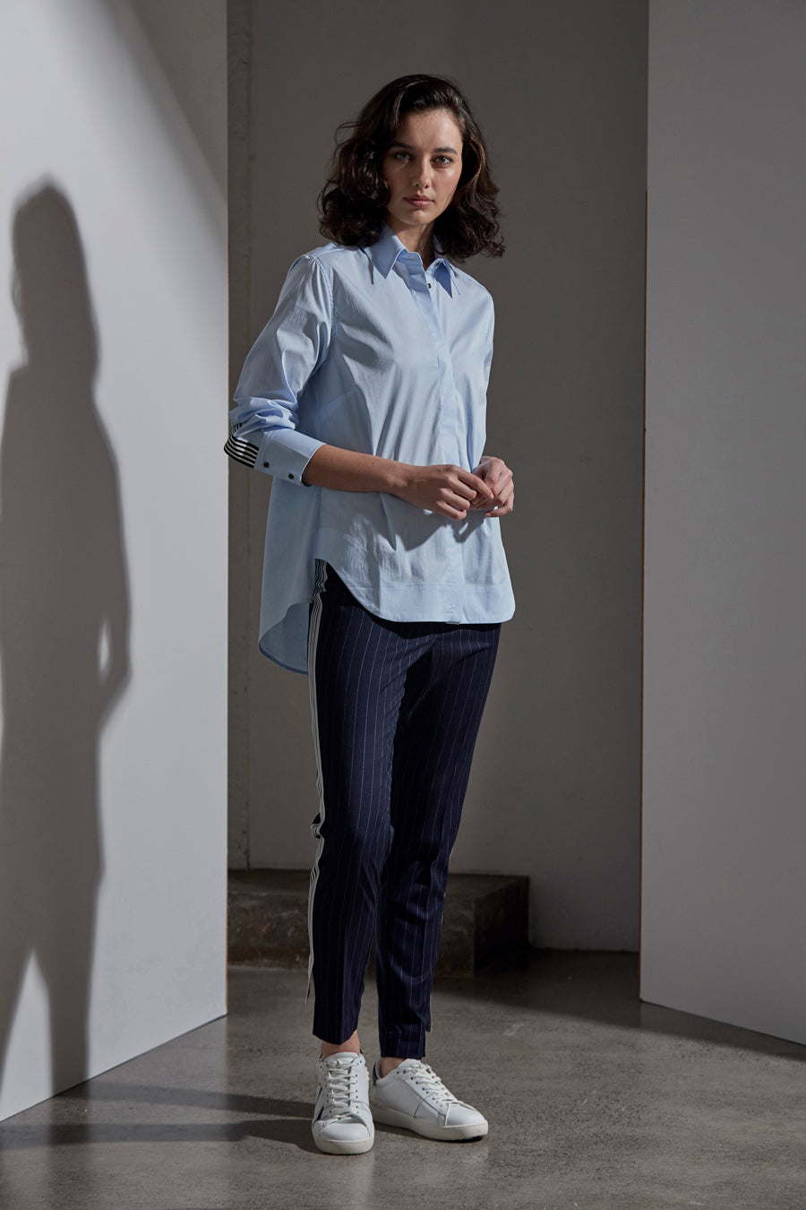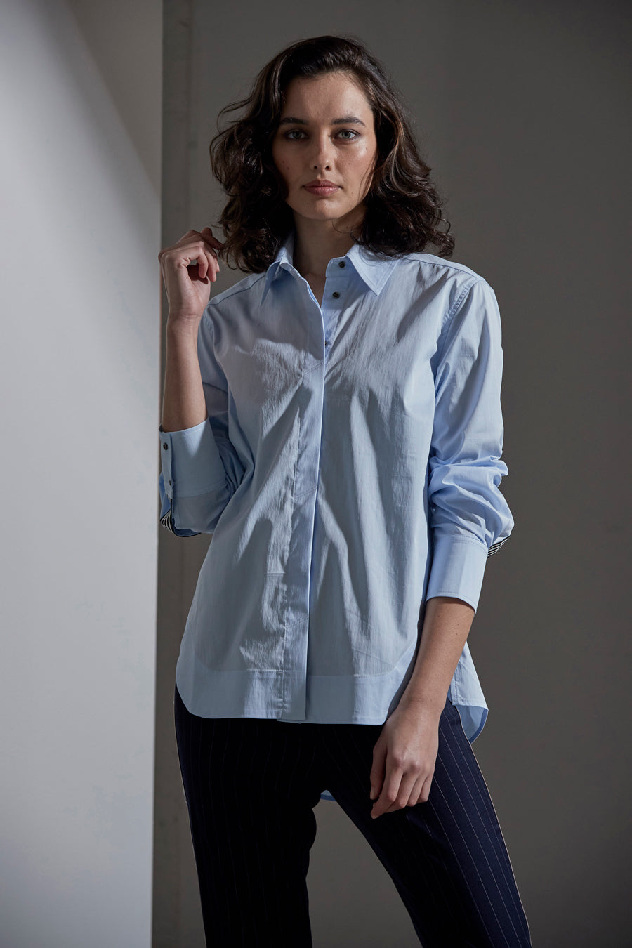 Charter Shirt — super-cool oversize shirt; concealed front button placket; long sleeve with stripe placket detail; contour front hem; back panel seam to create modern silhouette. Available in plain and stripe.