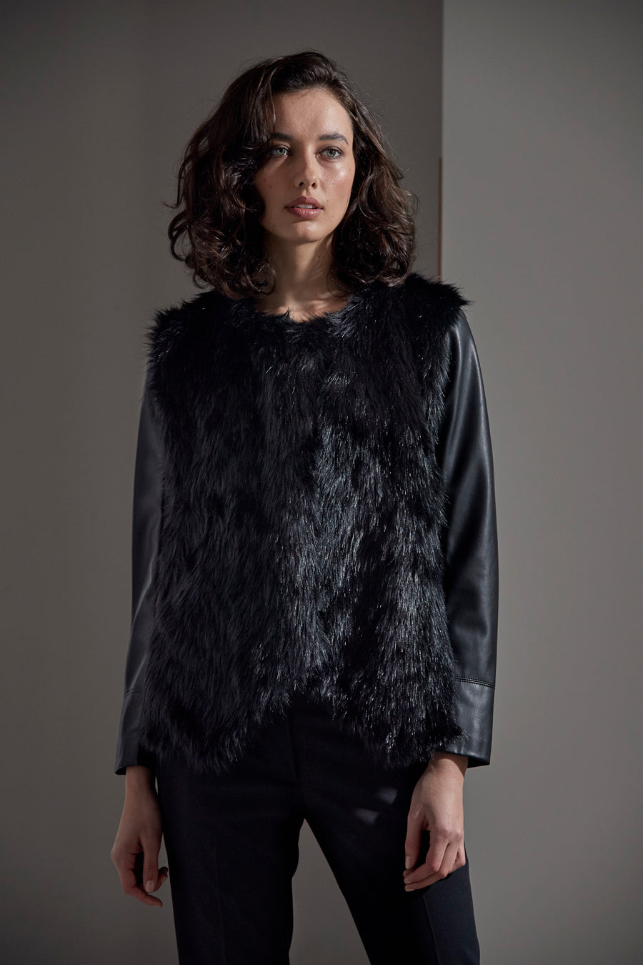 Simply fabulous jacket; faux fur on front body; faux leather sleeve; stretchy back body and inner sleeve for comfort.
