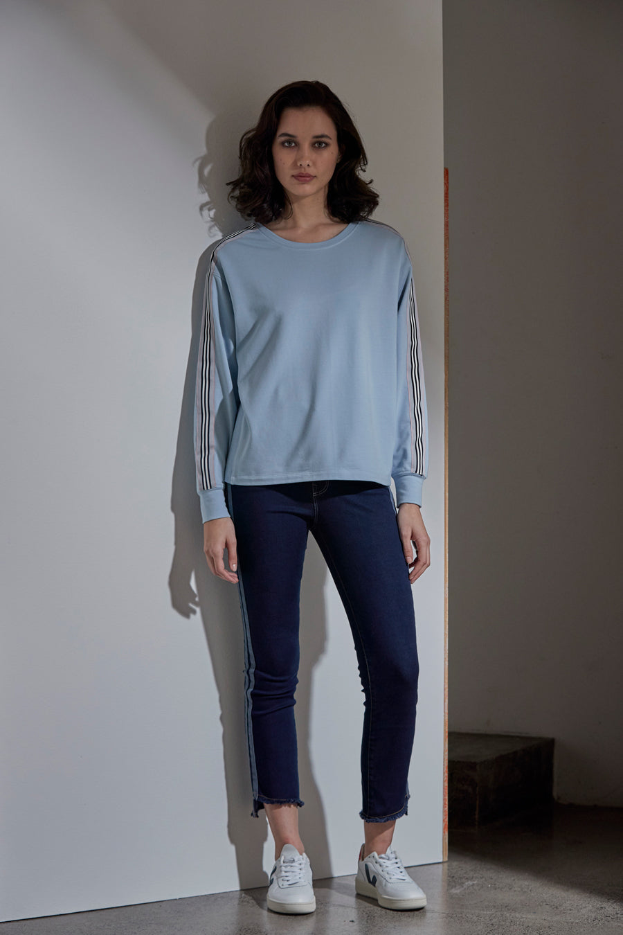 A smart casual sweatshirt; round neck; long sleeve; featuring novelty tape detail at shoulder and sleeves.