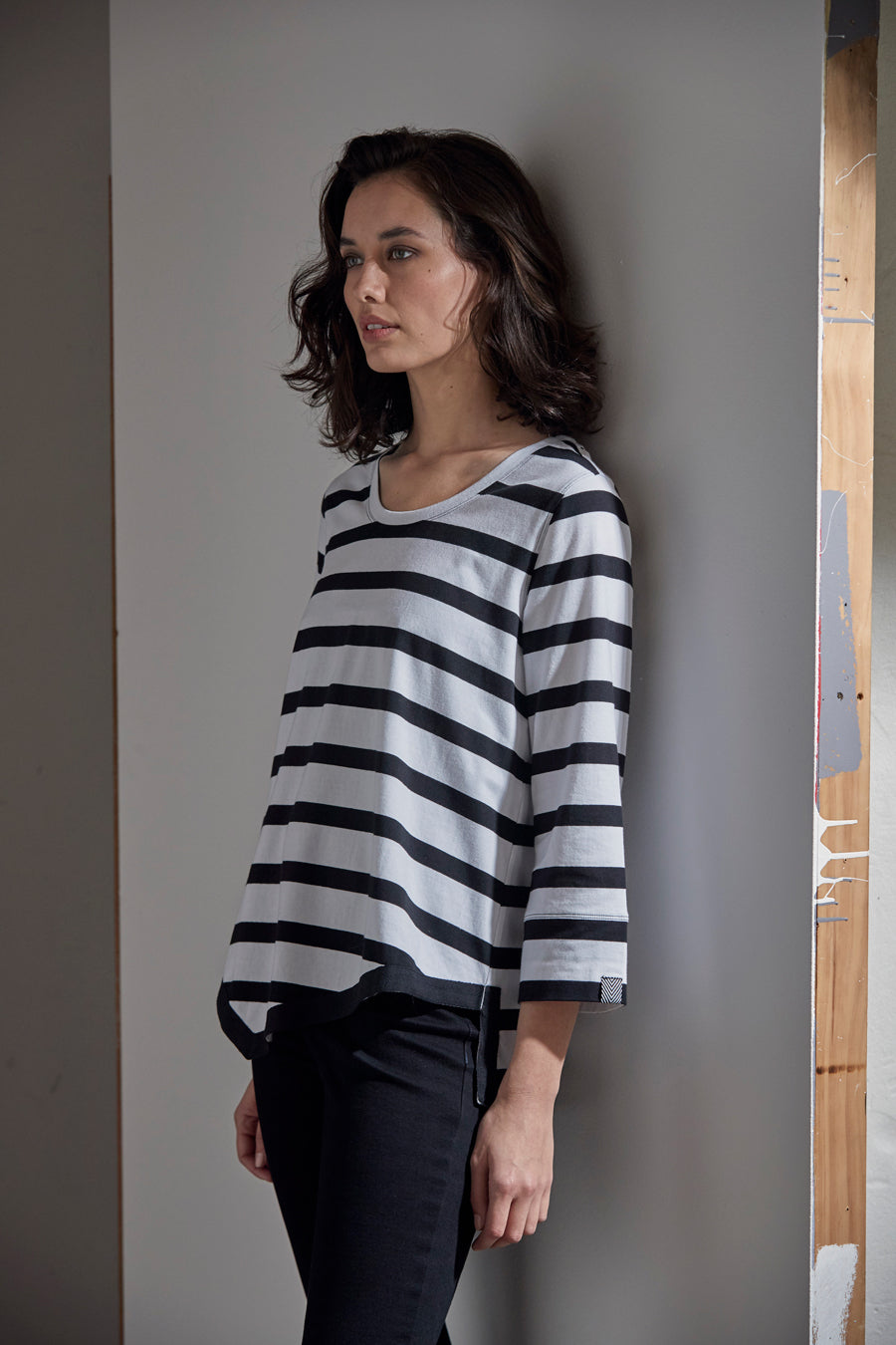 An easy-fit stripe tee; wide sleeve; scoop neck; featuring a unique hemline and herringbone tape edging.