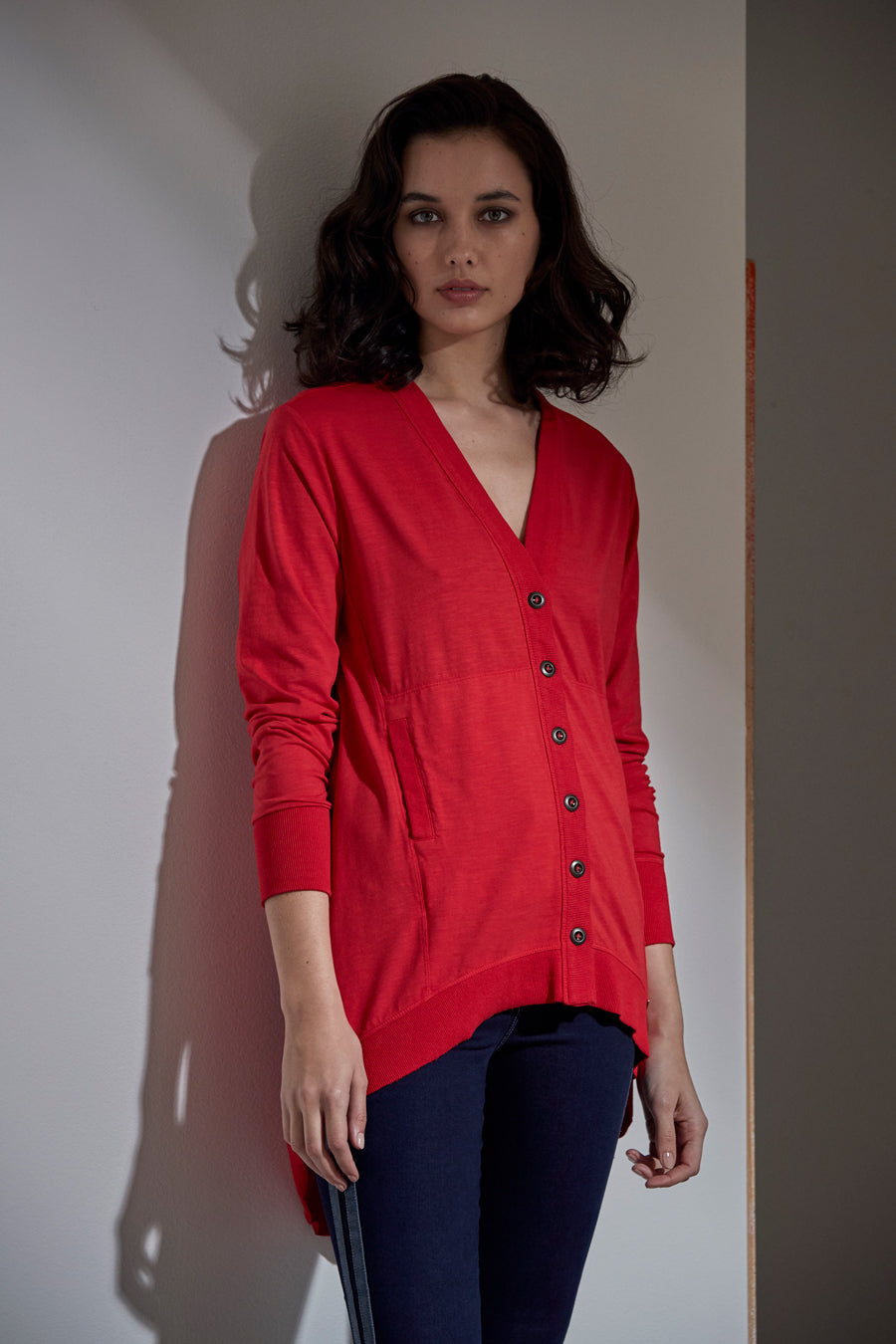 Long sleeve V-neck cardigan; button front; side pockets; curve back panel seams create a nice contour hem falling below hip.
