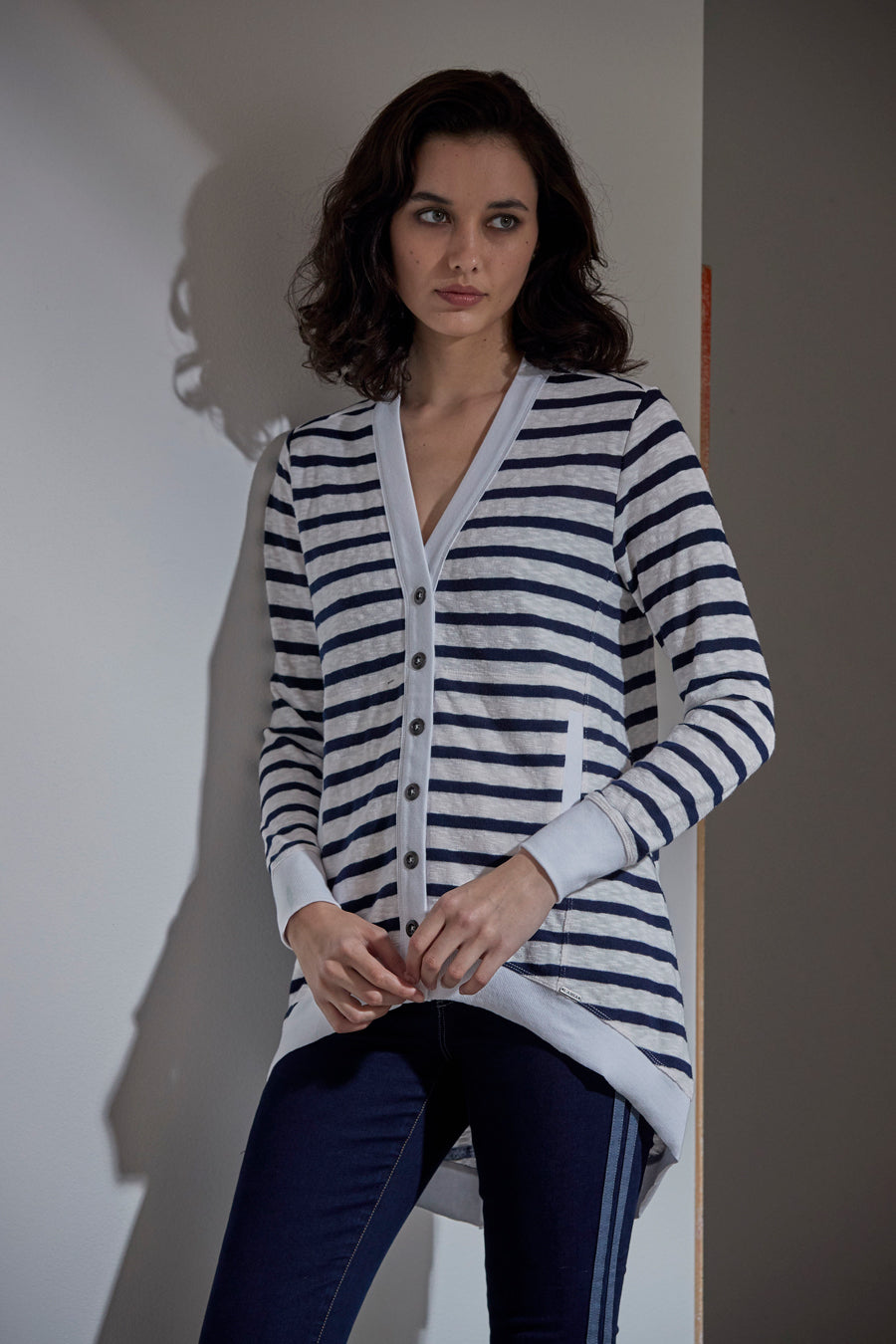Long sleeve stripe cardigan; long sleeve button front; side pockets; curve back panel seams create a nice contour hem falling below hip.
