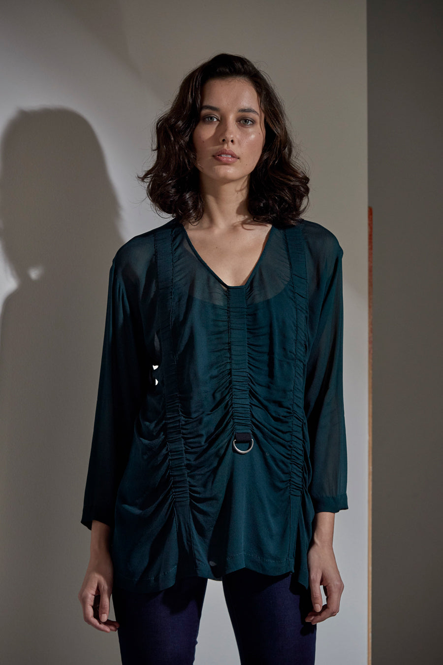 A graceful top featuring ruching detail; scoop neck; drop shoulder; elbow length sleeve.