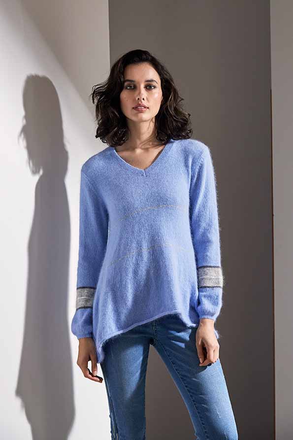 A soft angora blend V-neck sweater; long sleeve with subtle puff; hem is slightly contoured to give a floaty hemline. Available in solid Hot Pink or with feature stripes for other colourways.