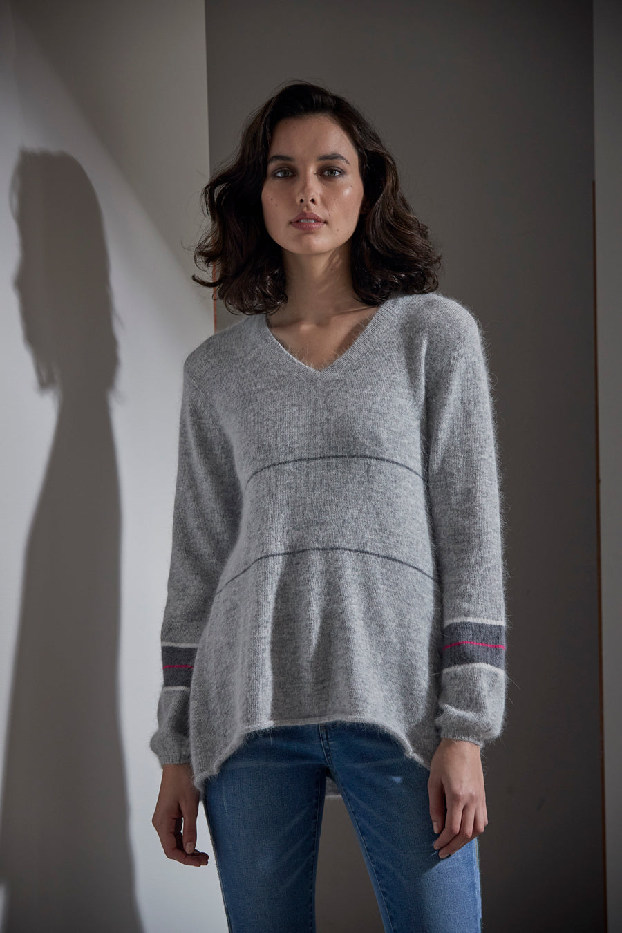 A soft angora blend V-neck sweater; long sleeve with subtle puff; hem is slightly contoured to give a floaty hemline. Available in solid Hot Pink or with feature stripes for other colourways.