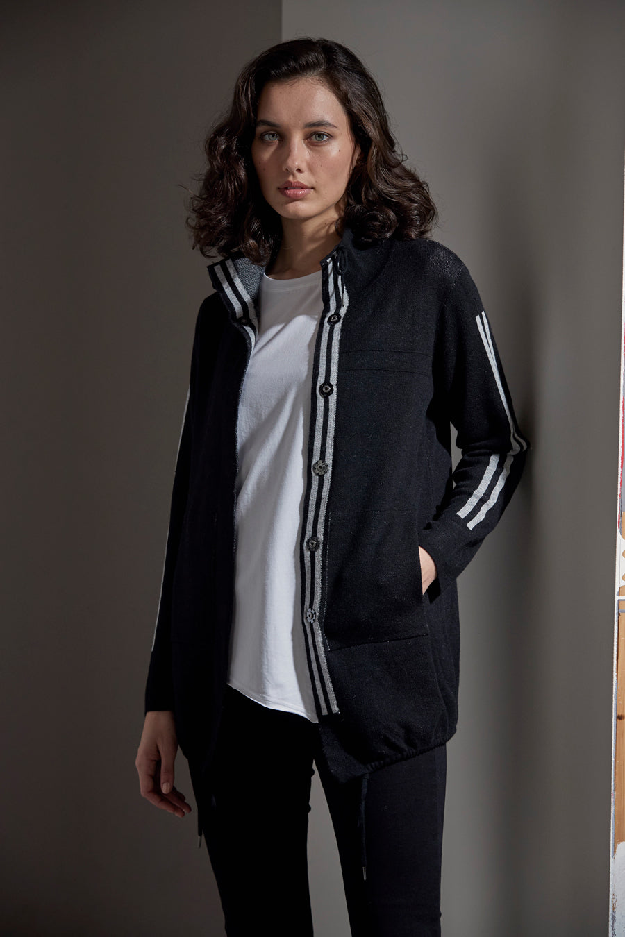 Hyde Coat is an essential coat for this winter — stand up collar drawcord at neck and hem; hidden front button placket with stripe detail which ties in with the sleeve stripes.