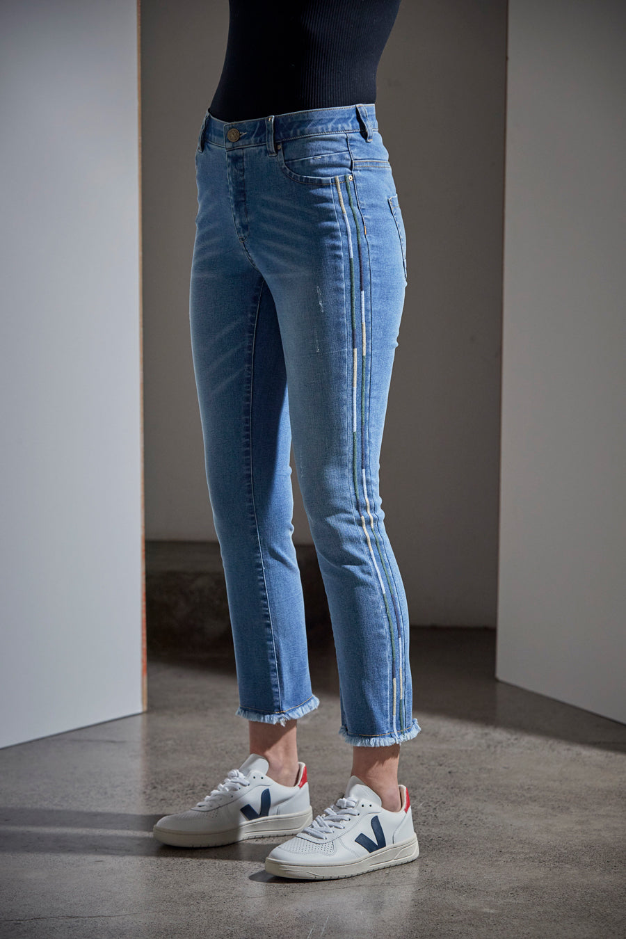 These mid-rise 7/8 length jeans feature soft denim with lots of stretch; embroidery down the outleg. Available in Distressed wash and Indigo.