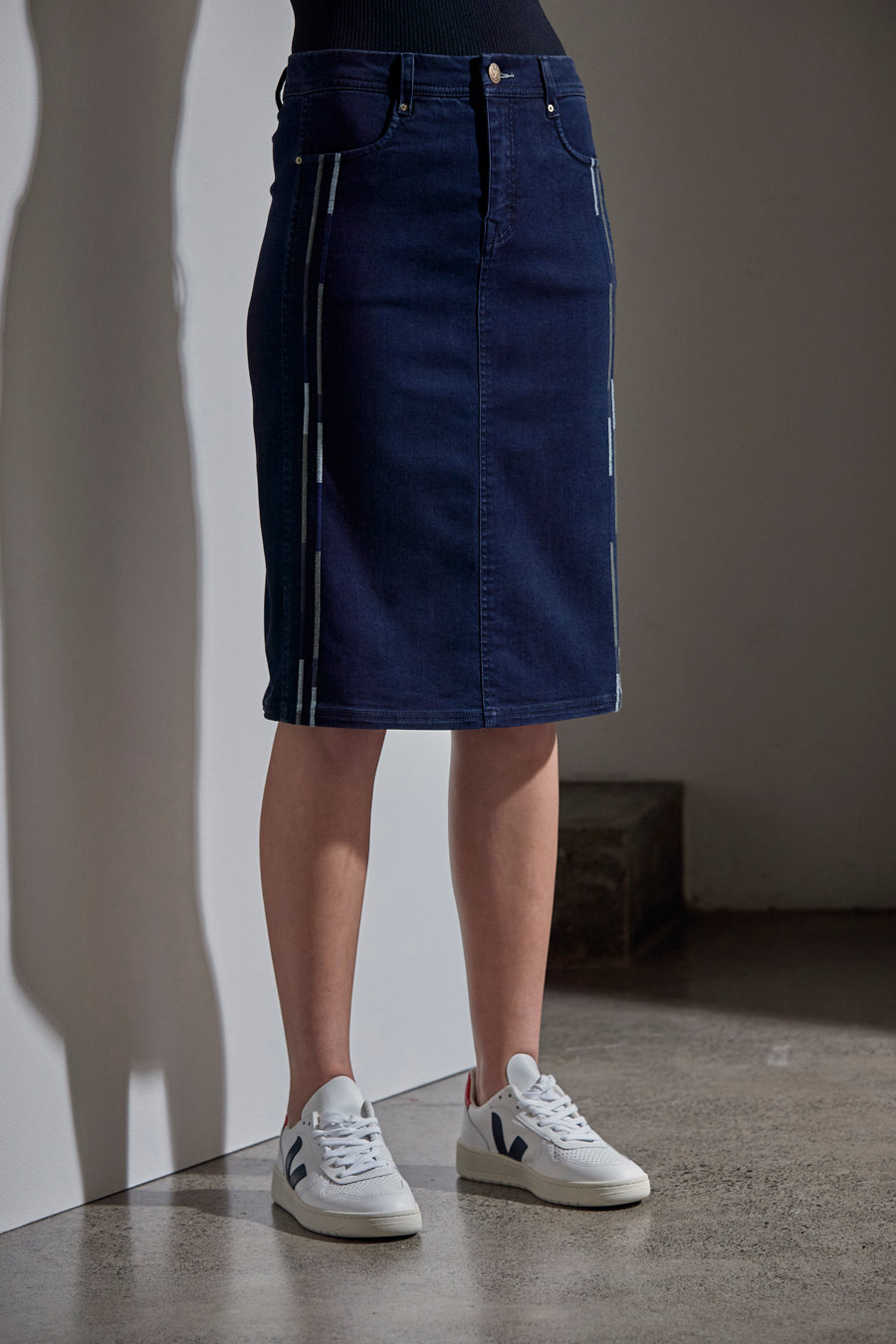 Soft stretch denim knee length skirt; featuring embroidery down the outseam.
