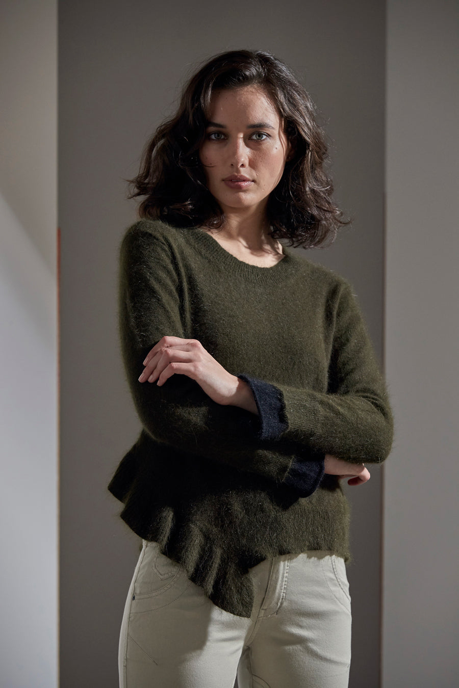 Soft angora blend crew neck sweater; long sleeve with contrast cuff; featuring asymmetrical hem panel.