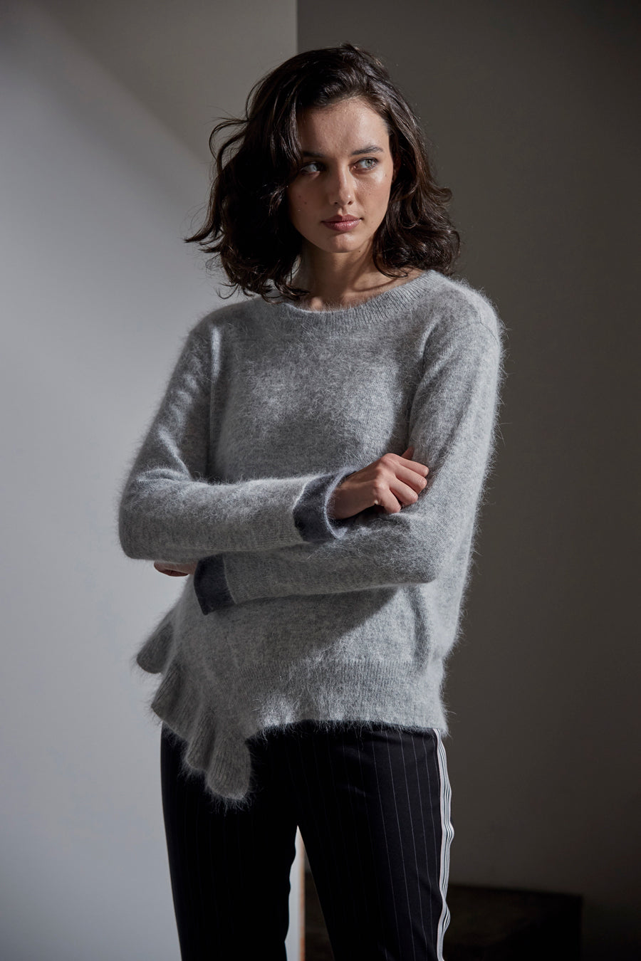Soft angora blend crew neck sweater; long sleeve with contrast cuff; featuring asymmetrical hem panel.