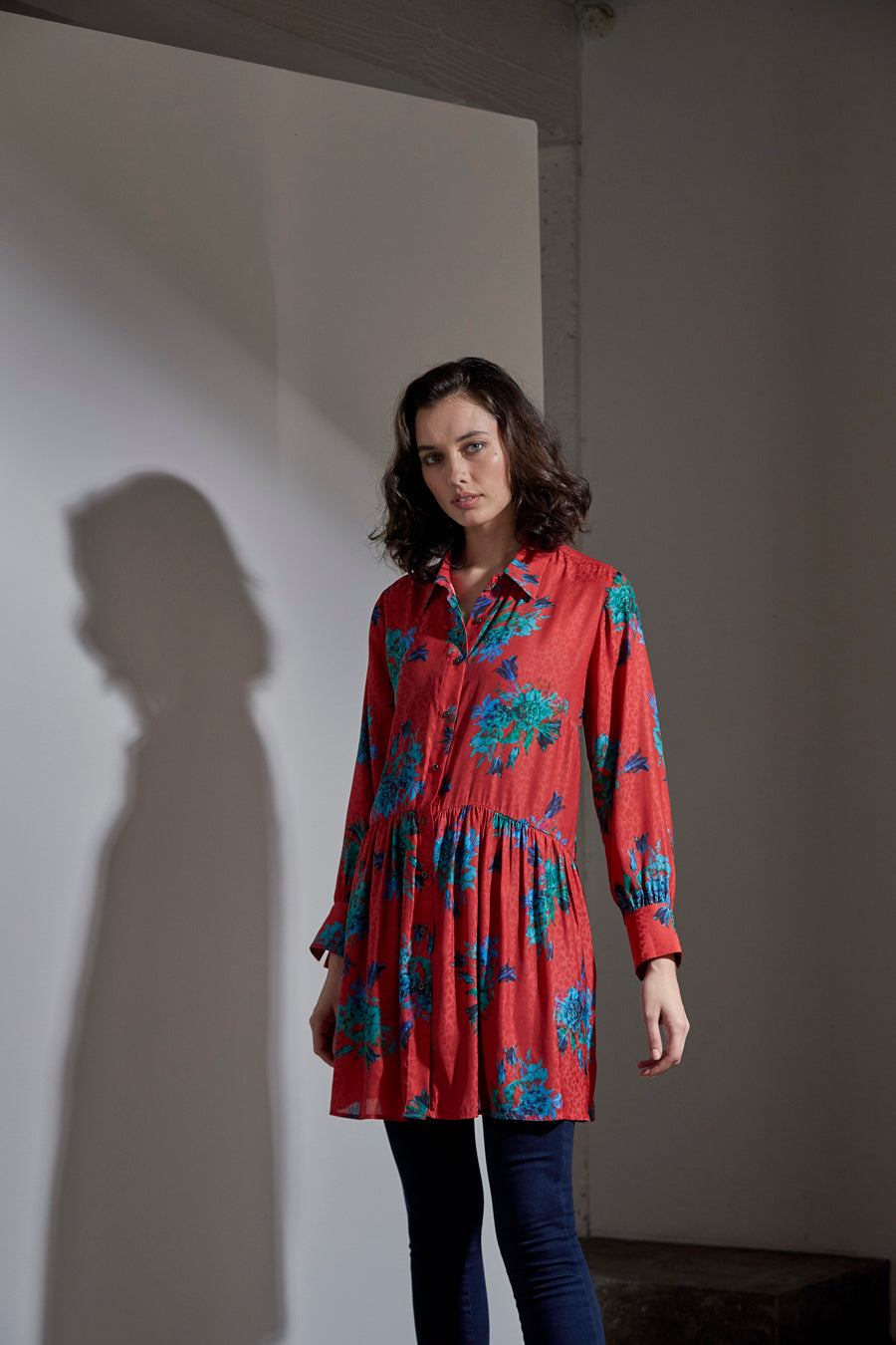 A swingy shirt dress in Paradise Floral print; long sleeve; button front; with gathered waist panel.