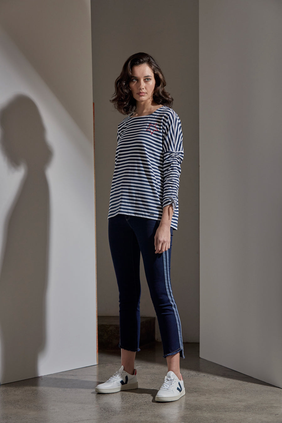 A stripe top for the Paris look — drop shoulder; long sleeve with drawcords; featuring side seam tape detail. Available with or without star embroidery at front chest.