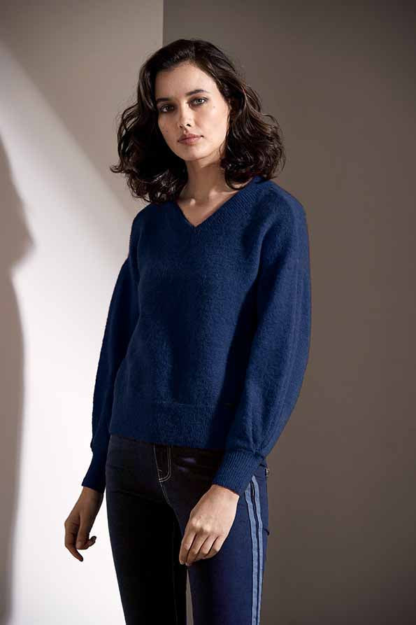 A modern and luxurious sweater; mock turtle neck; drop shoulder with a full sleeve.
