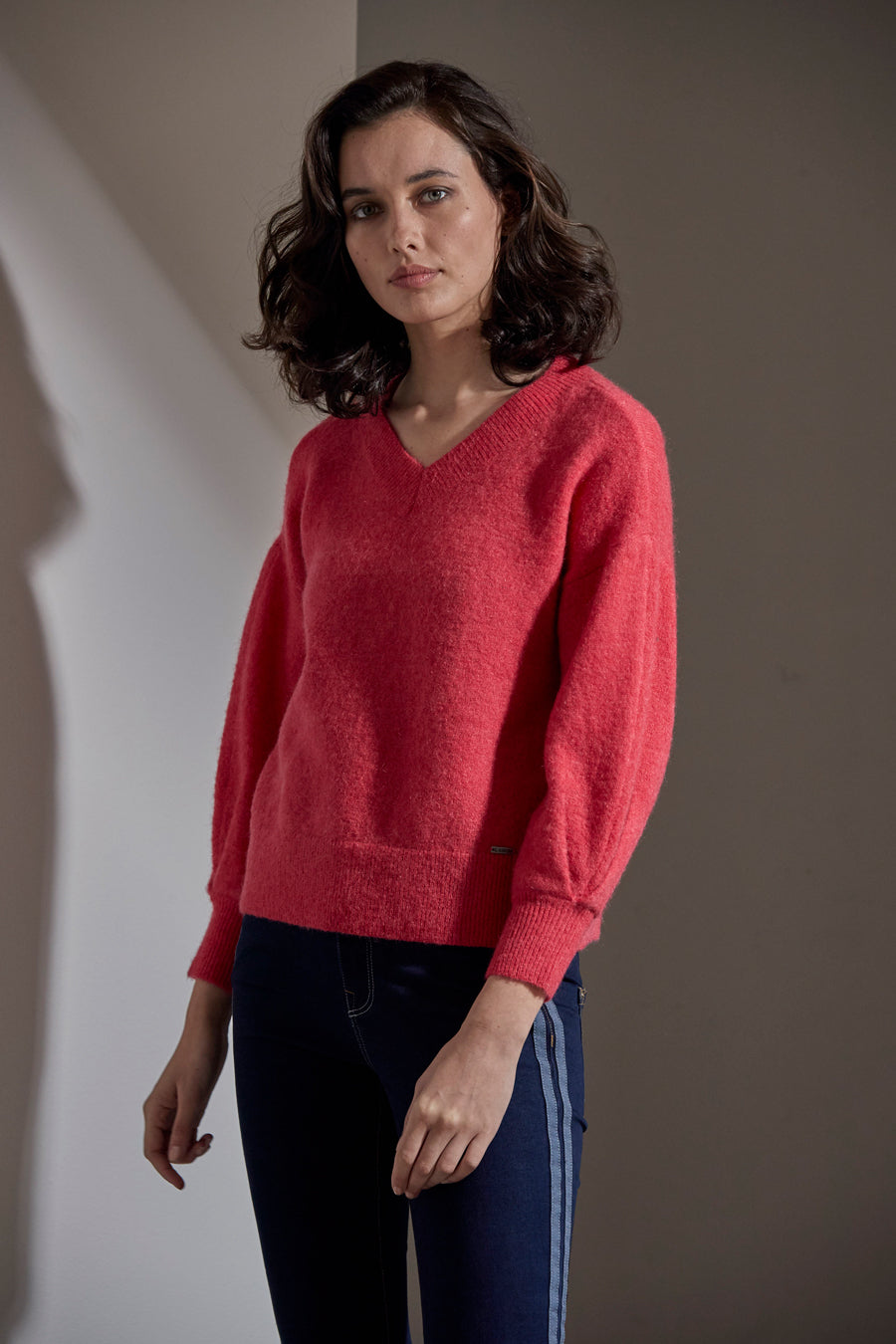 A modern and luxurious sweater; mock turtle neck; drop shoulder with a full sleeve.