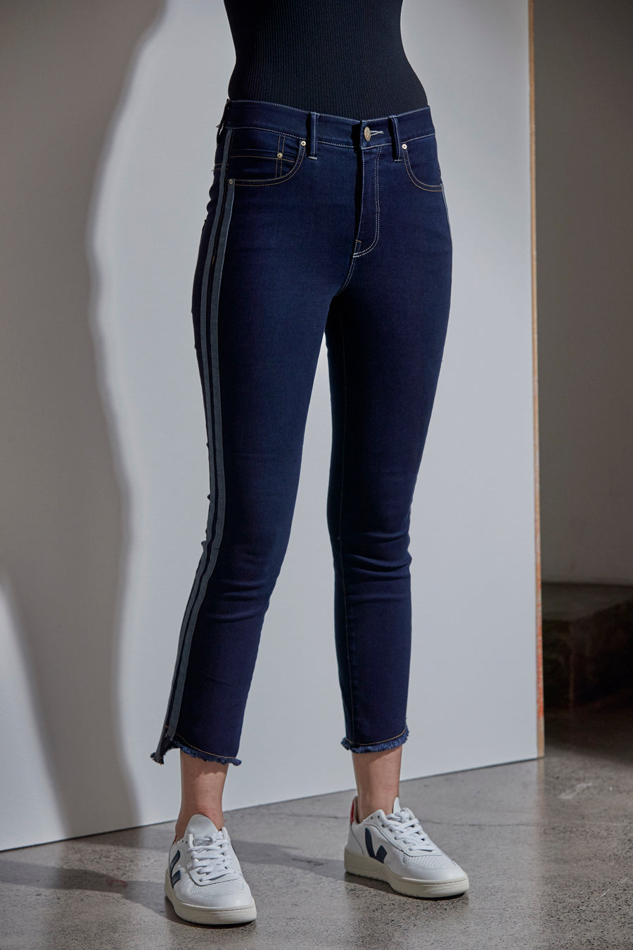 Mid-rise 7/8 length jeans in soft denim with lots of stretch; featuring reverse denim strips down the outleg.
