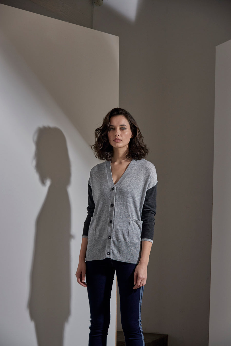 Seattle Cardi; a classic cardi with modern fit — V-neck; button front; relaxed fit body with pockets and hi-low hem; subtle contrast colour sleeve except on colour Red.