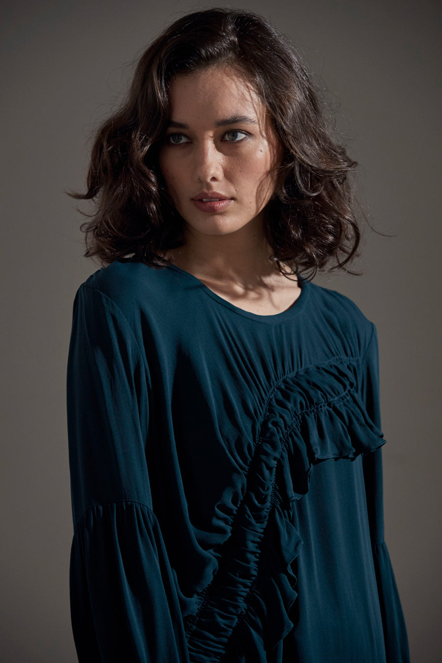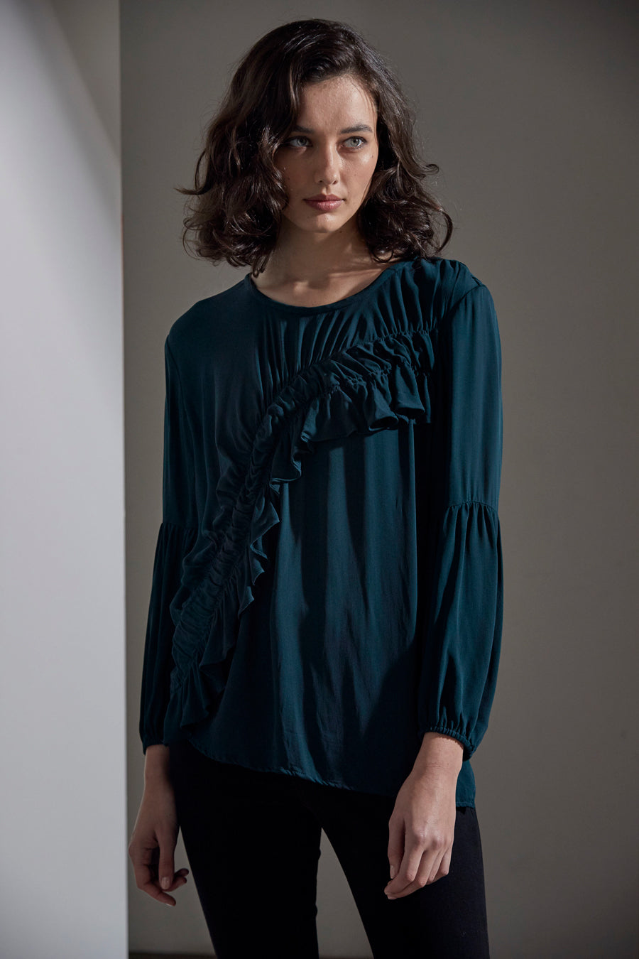 Shadow Top is an alluring top; round neck with back opening; long sleeve with puff lower sleeve; featuring diagonal front ruching detail.