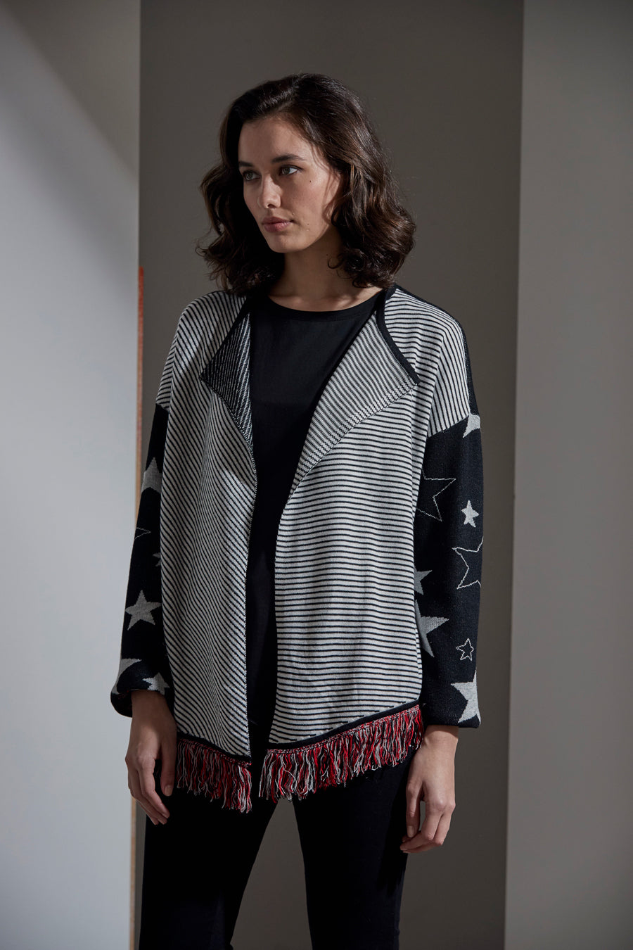 A striking throw on jacket; crossover front body with different stripe direction; fringe hem; featuring intarsia star sleeve and back body.