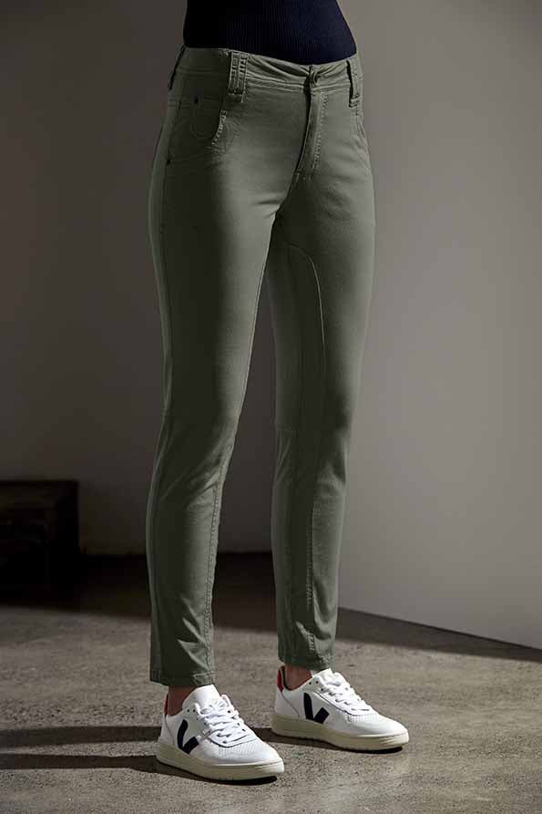 Cool polished stretched cotton Trent Pant; featured jean pockets and dart detail. The soft handle and slightly distressed finish is achieved by a special garment wash.