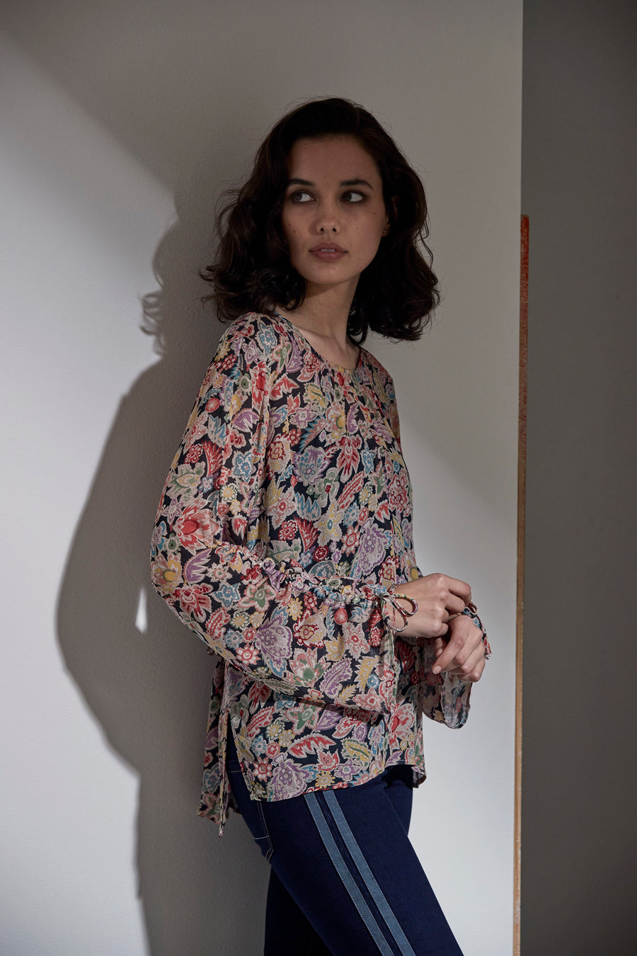 A stunning top in Vault Paisley print — round neck with keyhole back opening; long wide sleeve with ruching ties.