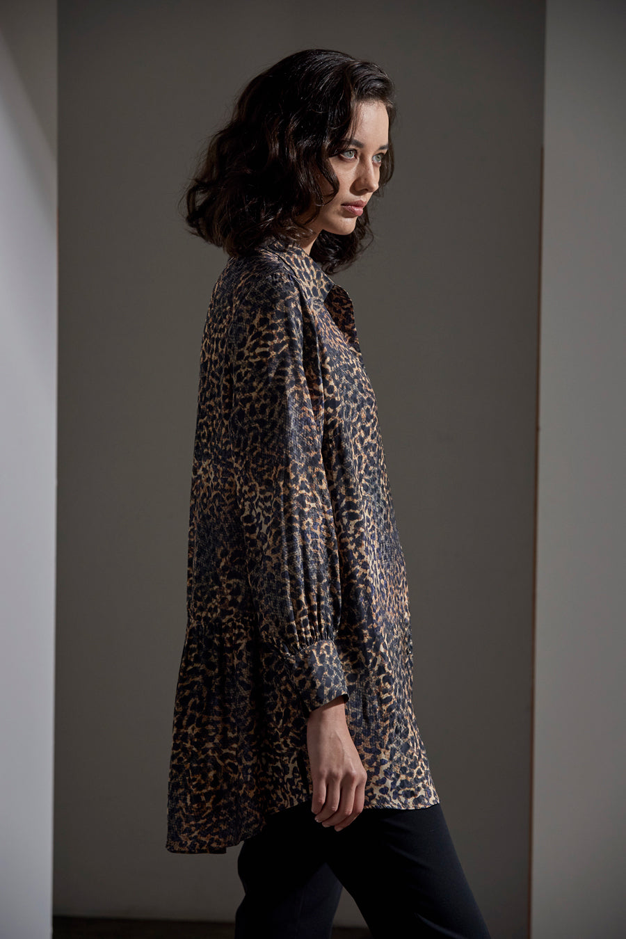 A long-line shirt in Vixen print; long sleeve; button front; with gathered back hem panel.