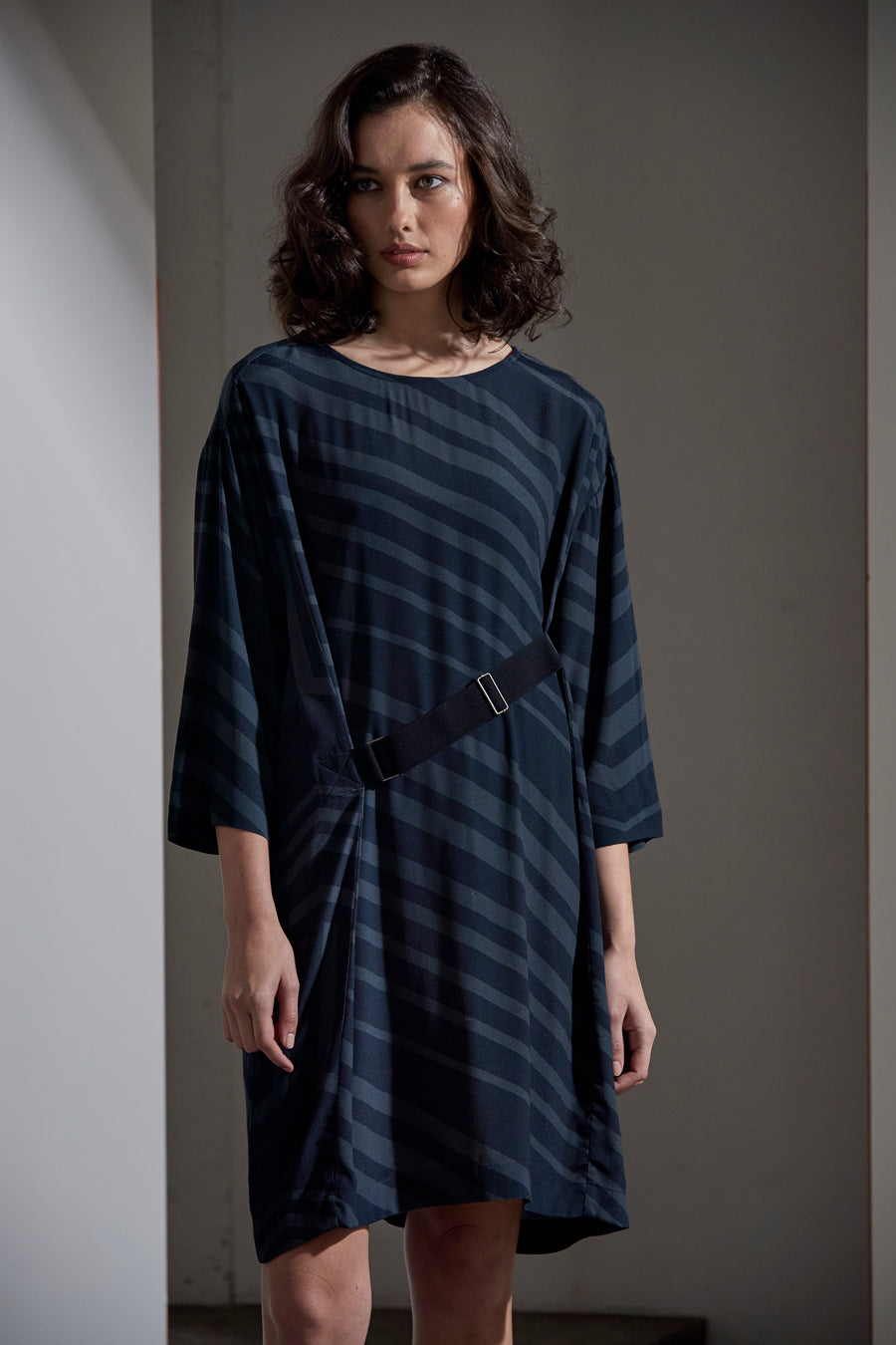 Tunic top in Xavier stripe print; round neck; long sleeve; featuring adjustable elastic band detail.