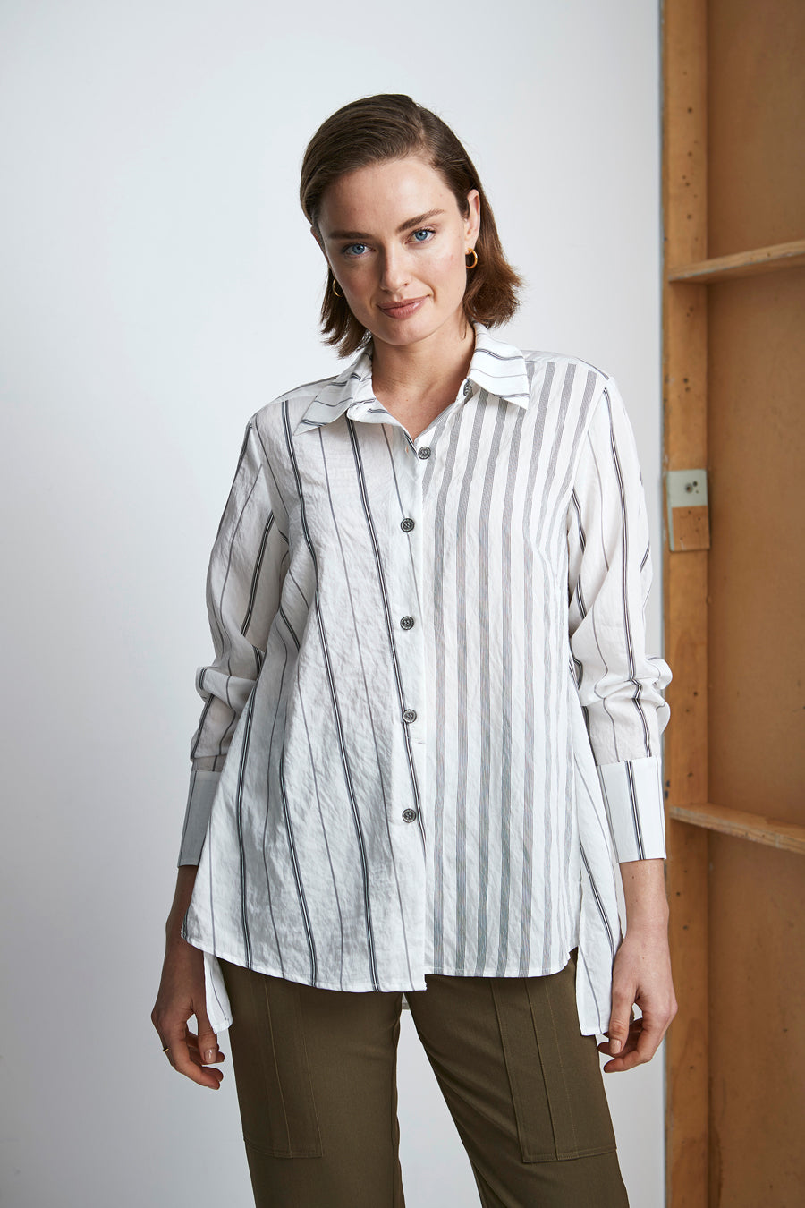 A classic shirt with a modern twist, oversized fit with iconic cuff detailing and a high - low hem. Featuring: different stripes and direction, in a light weight, soft rayon fabric.
