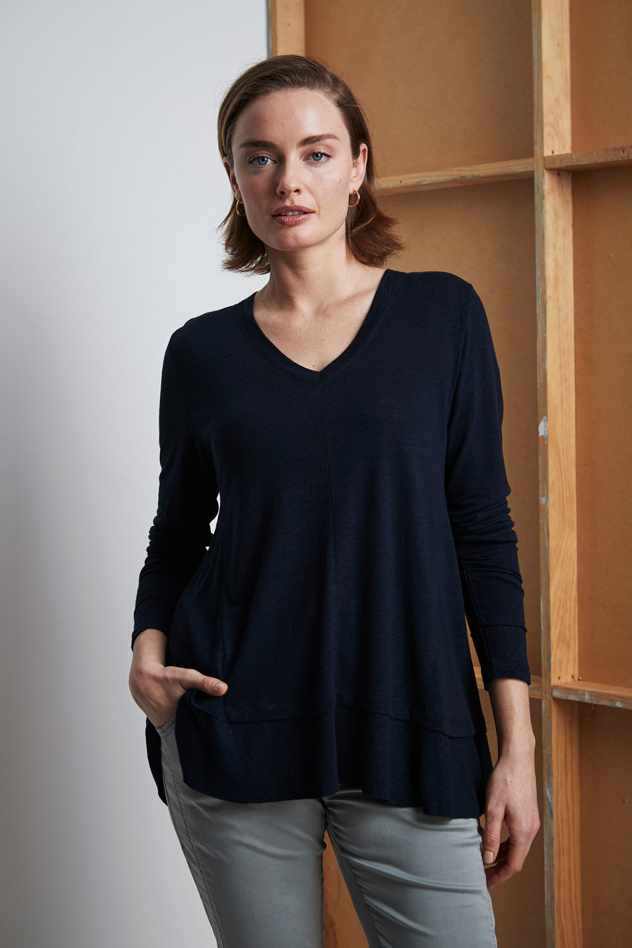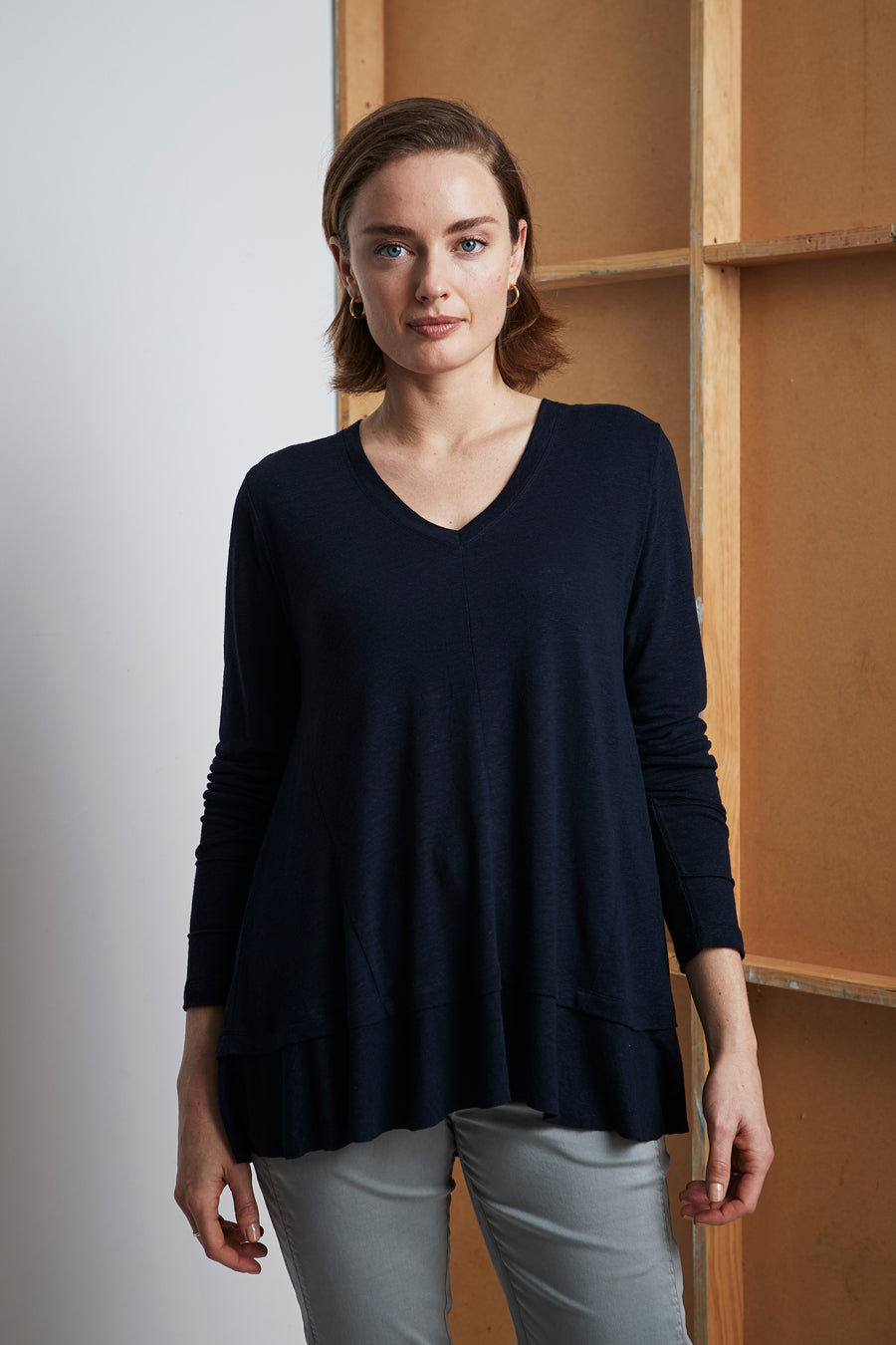 Soft, casual cotton top, V-Neck, long sleeves and A-line shape; highlighting the drape of hem panel.
