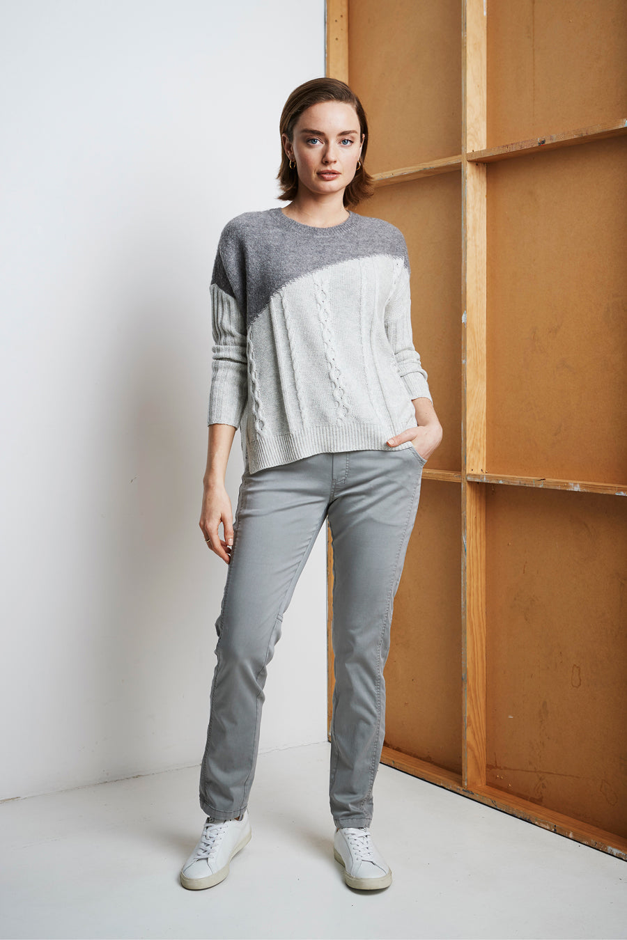 Birch sweater features diagonal contrast mixed knit detailing, Boxy silhouette with high-low hem and long chunky ribbed sleeves.