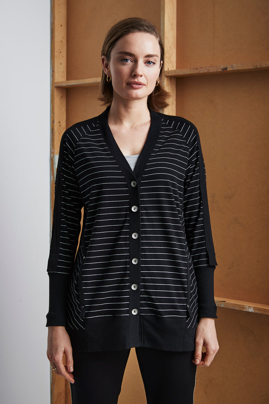 Longline V neckline cardigan, available in three colours; long sleeve with ribbed cuff. Panel seams featured to create a flattering contour, hemline falling below hip. Slightly distressed finish is achieved by special garment wash.