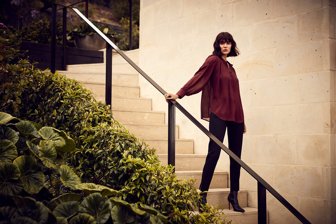 Our Captain Shirt; easy transition from day to night, available in 3 winter tones. Gathers to create a feminine silhouette, with rouleau loops and buttons, featuring tie at front opening.