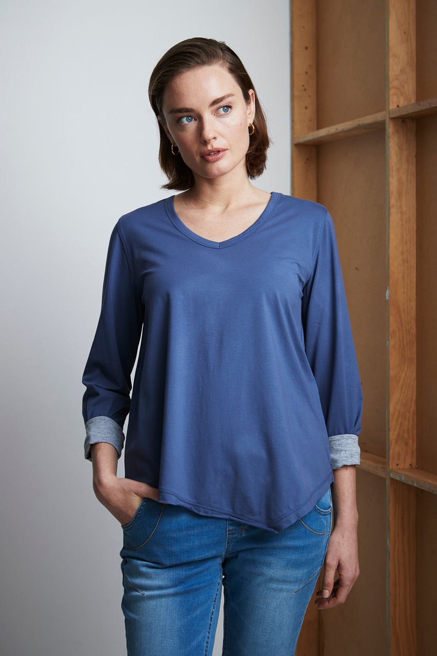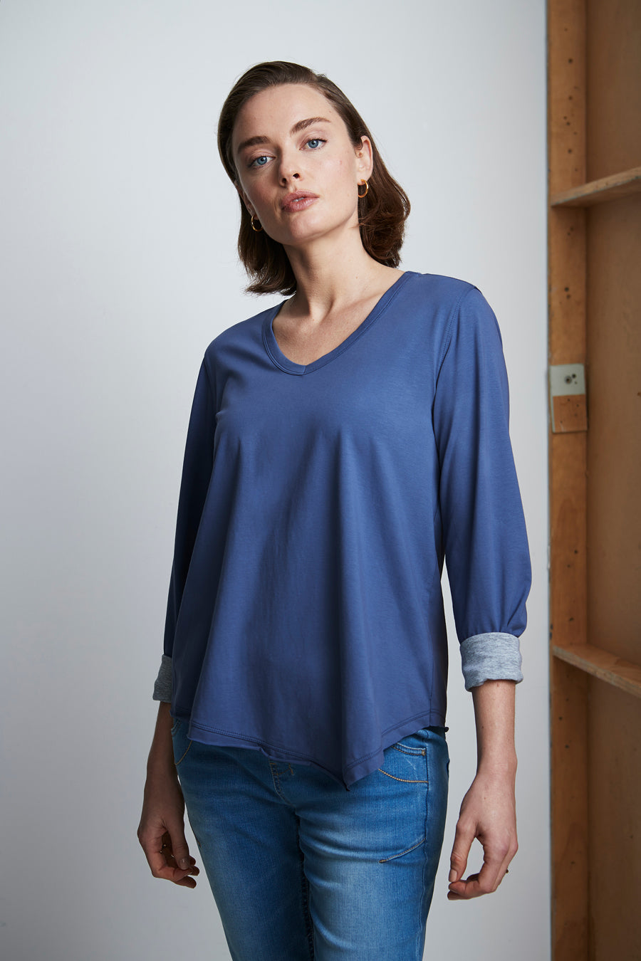 An easy fit tee, V-neckline, 7/8 sleeves with a turned-up contrast cuff. Featuring a unique asymmetrical raw edge hemline.