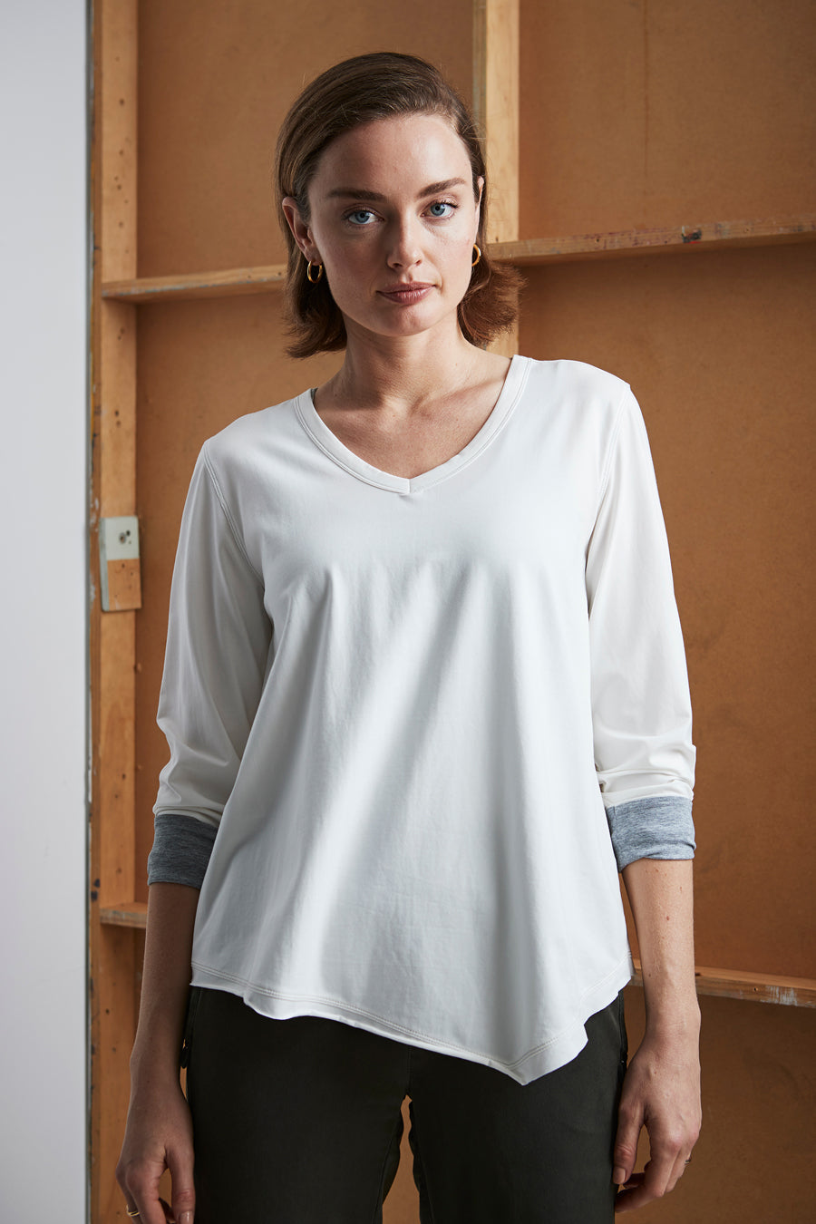 An easy fit tee, V-neckline, 7/8 sleeves with a turned-up contrast cuff. Featuring a unique asymmetrical raw edge hemline.