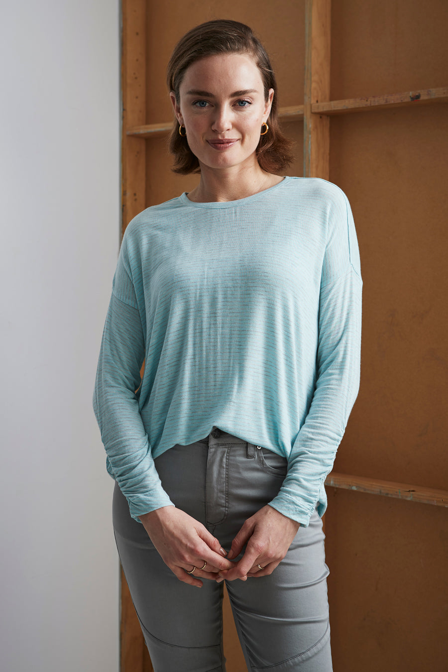 The Chase top is a soft oversized fit, soft stripe; featuring round neck, fitted long sleeves with elastic gather sleeve detail at cuff.