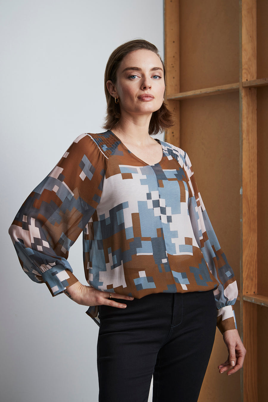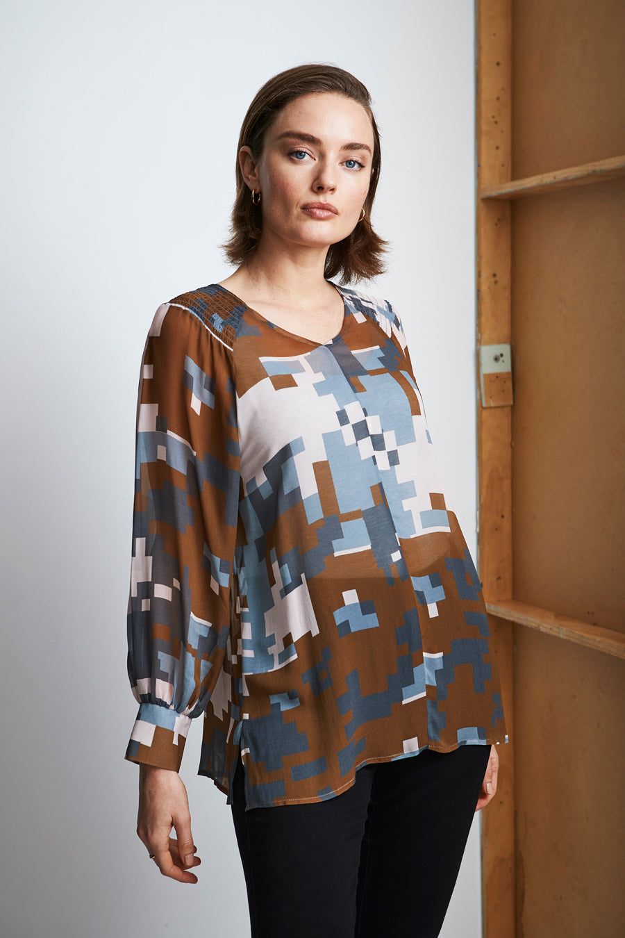 Data sheer top; designed to be a relaxed floaty fit, with long sleeves. Featuring elasticated gather detailing at shoulder and soft gathered sleeves with a wide cuff.