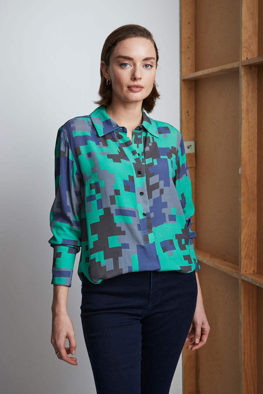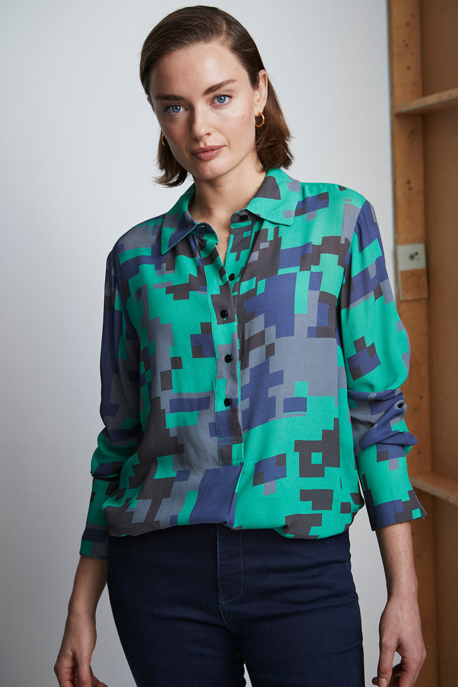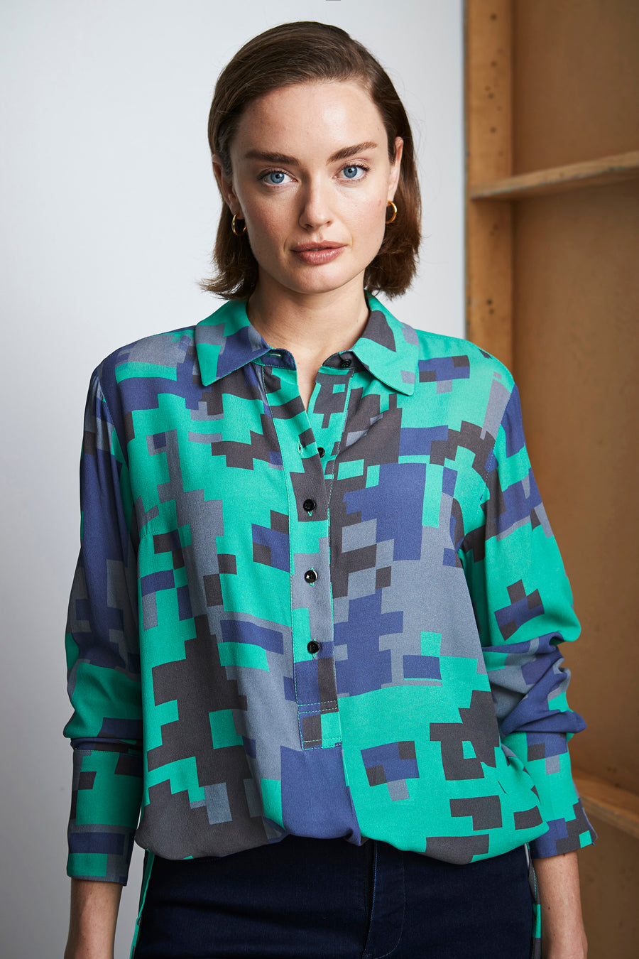 classic long-line shirt in soft viscose, showcasing our Data Print. This shirt is designed to be loose fitting - long sleeves, featuring a wide sleeve cuff and a wide collar.