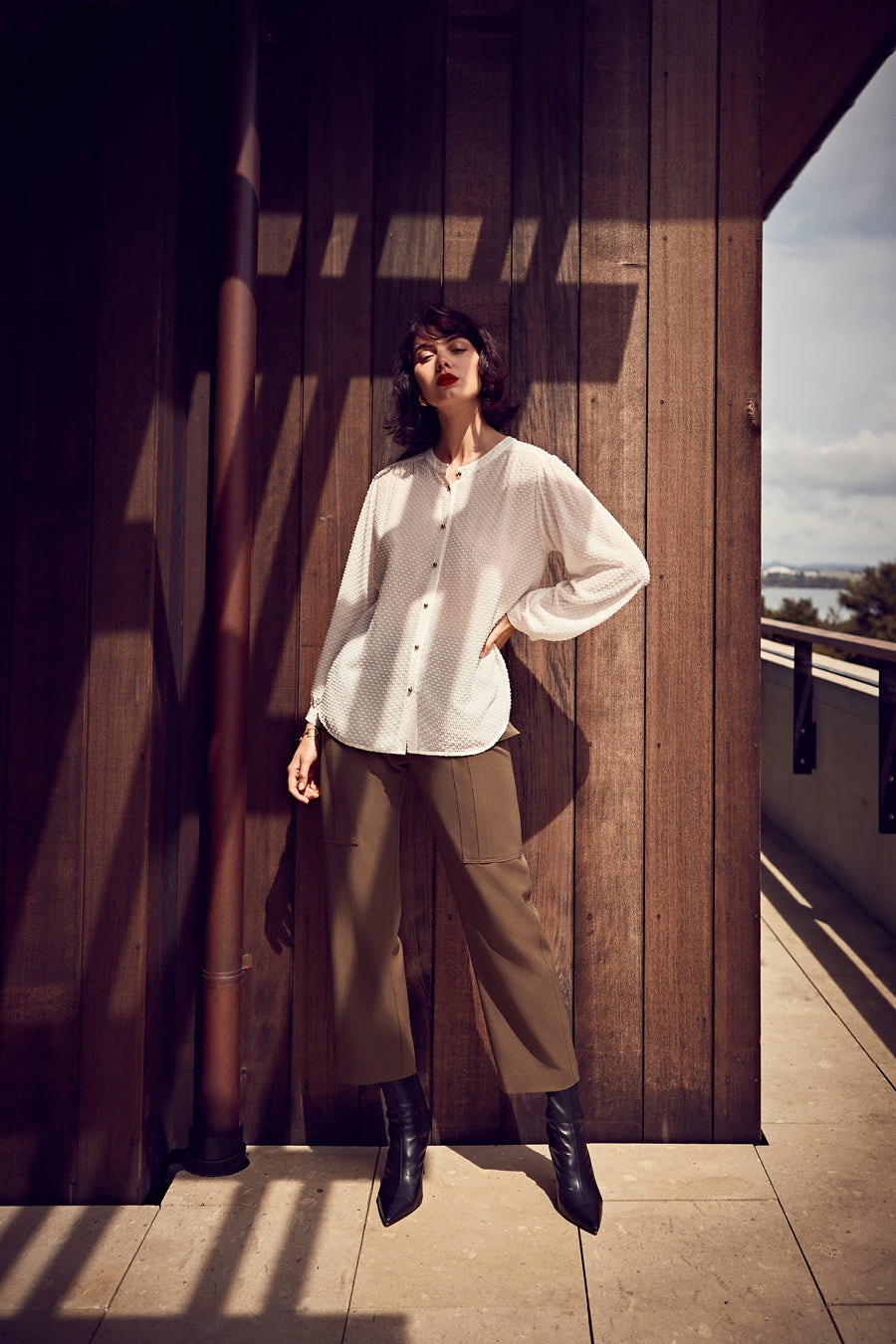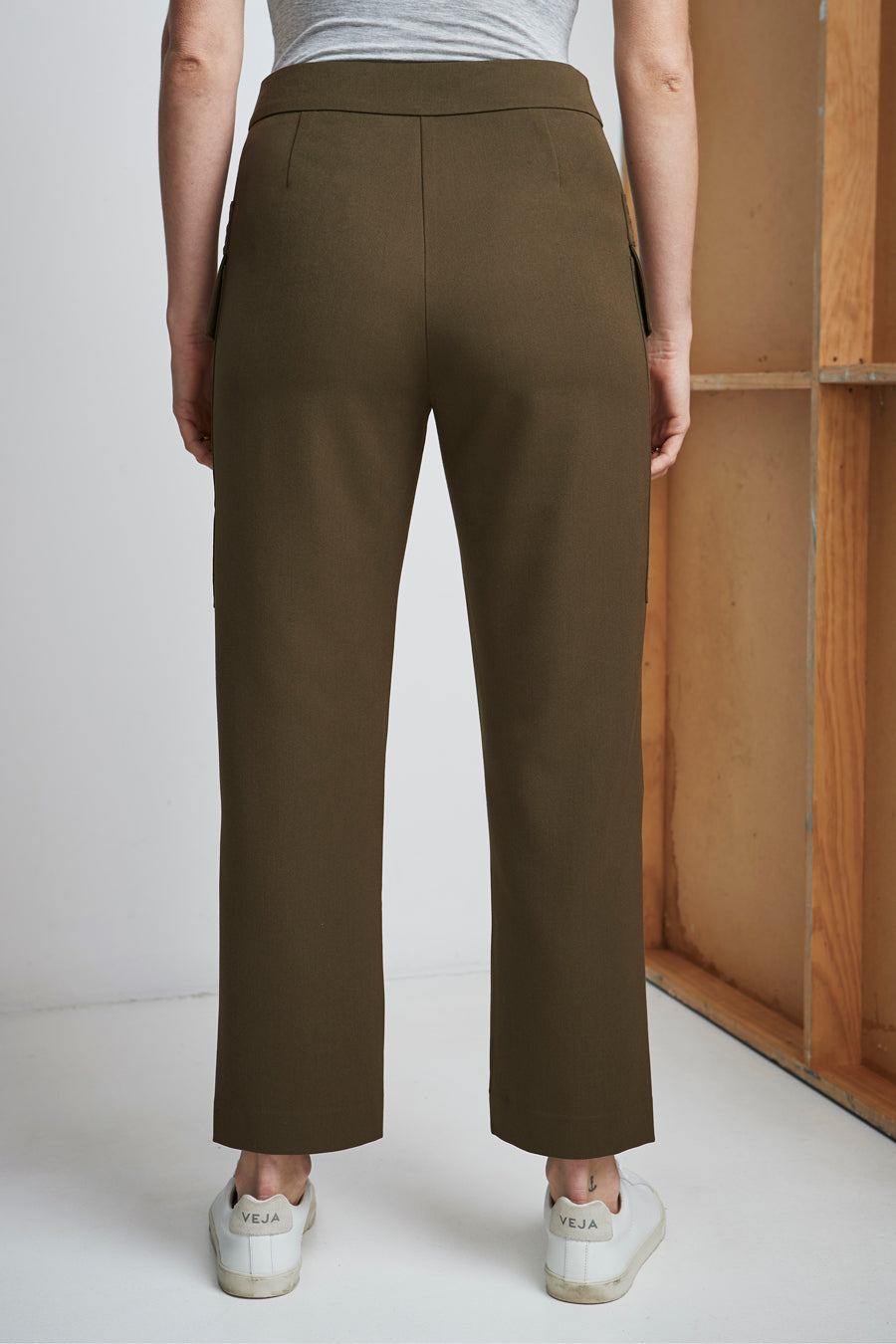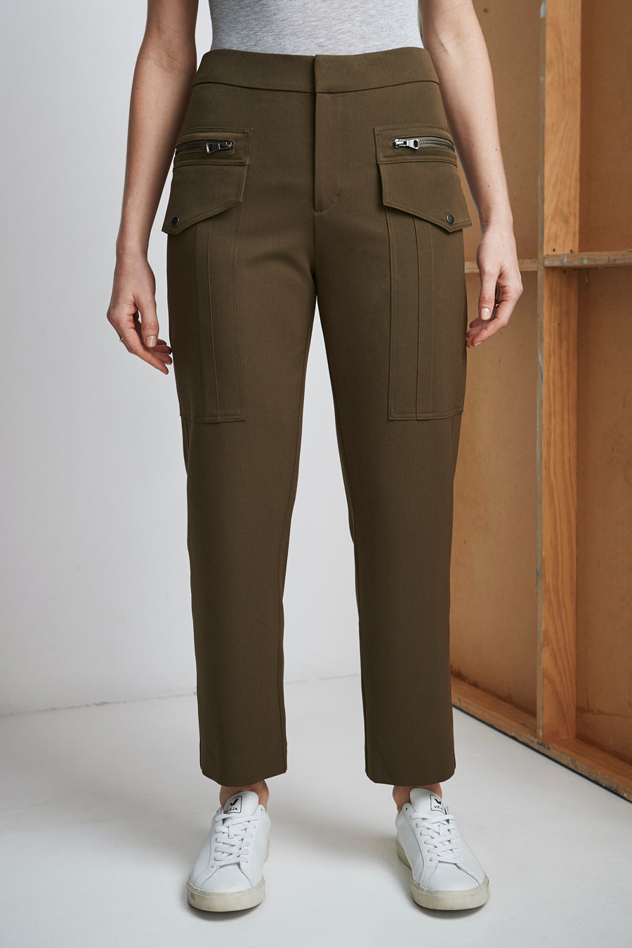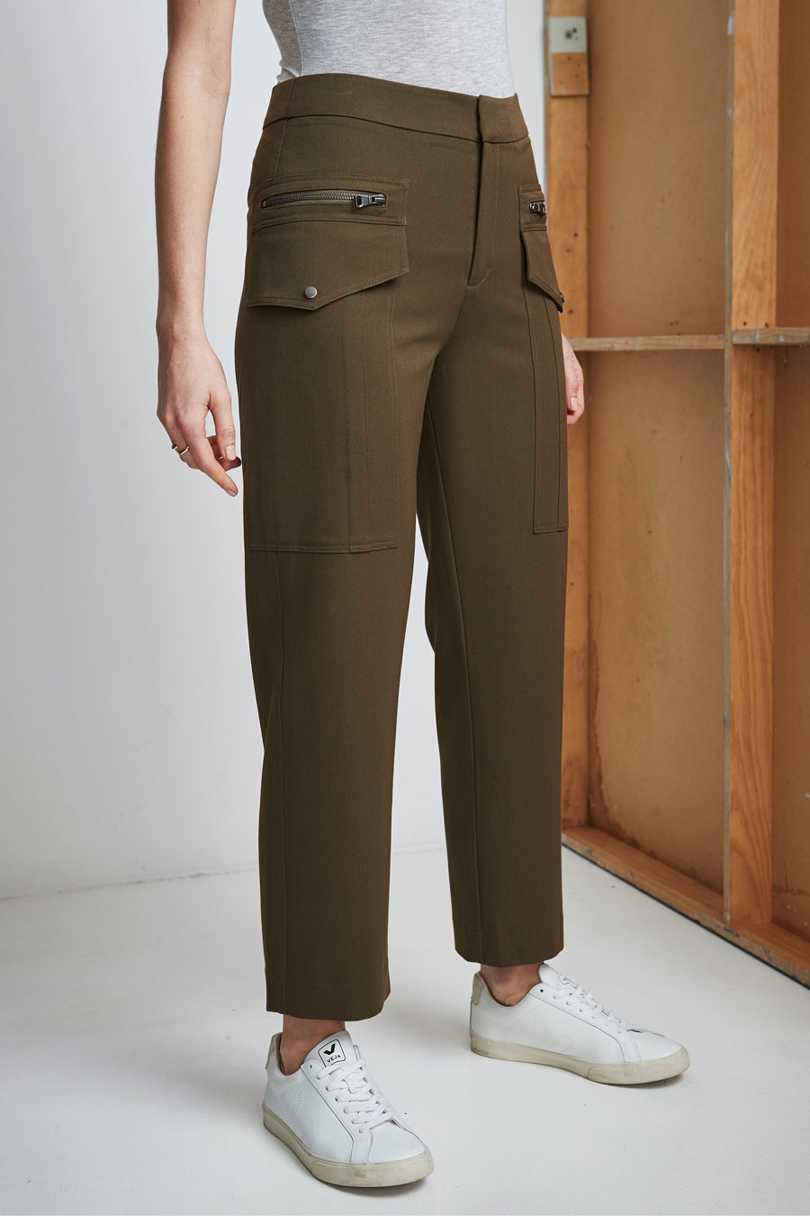 A modern 7/8 pant, with large cargo front pockets, chunky zip detailing, straight leg and menswear finished shaped waistband.